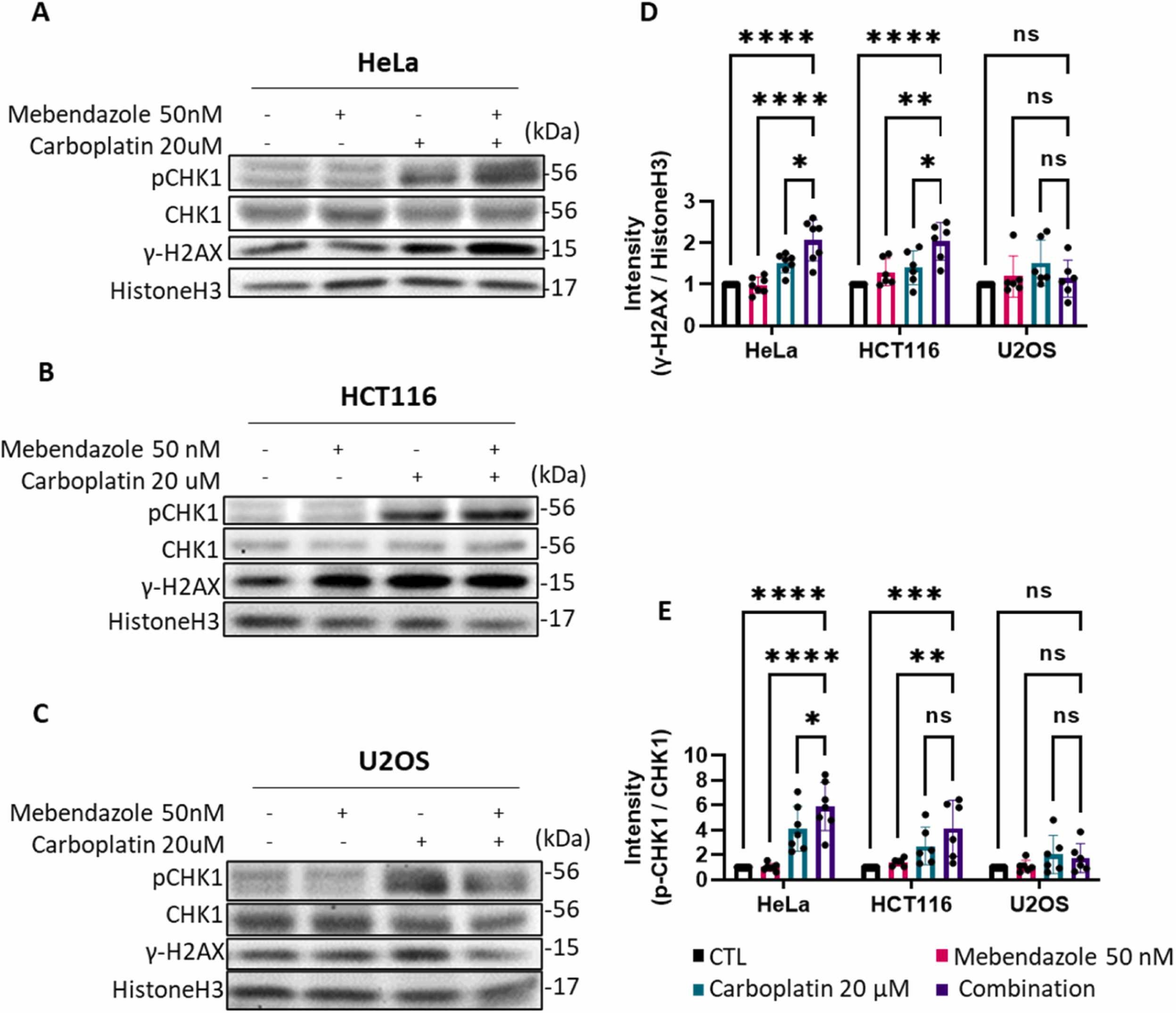 Western blot analysis of lysates from HeLa, cells treated with DMSO (CTL), MBZ, carboplatin, combination of MBZ and carboplatin, with or without ATR inhibitor. VE-821 under low-serum conditions. pCHK1 and histoneH3 antibodies were used for the assay. pCHK1 signals were normalized using HistoneH3 as a loading control. Data are shown as fold changes relative to DMSO-treated cells (CTL). Error bars represent mean ± standard deviation. P values were calculated by two-way ANOVA (n = 3).