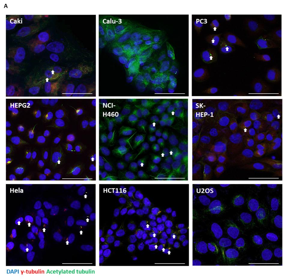 Several types of cancer cell lines were tested for cilia formation by incubating in low-serum media for 48 h. The primary cilium was labeled with acetylated tubulin (green and white arrows). The basal body/centrosome was labeled with γ-tubulin (red). Nuclei were labeled with DAPI (blue). Caki, PC3, HEPG2, NCI-H460, SK-HEP, HCT116, and HeLa cells showed evident formation of primary cilia, whereas U2OS cells were not able to induce ciliogenesis.