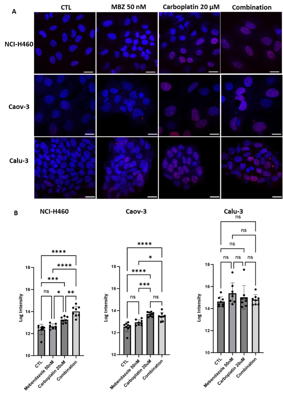 (A) NCI-H460, Caov-3, and Calu-3 cells were treated with DMSO (CTL), MBZ, carboplatin, or a combination of MBZ and carboplatin at the indicated concentrations for 48 h under low-serum conditions. DNA damage was visualized with anti-γ-H2AX antibody (red), and nuclei were labeled with DAPI (blue). Scale bar = 20 µm.