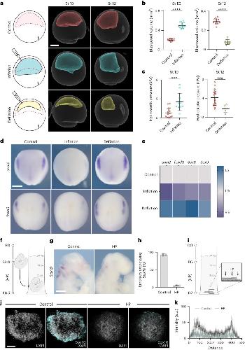 Fig. 2: Loss of neural crest induction is driven by an increase in hydrostatic pressure. a, The mechanical assays (left) and micro-CT scans (middle and right) of control (red), inflation (cyan) and deflation (yellow) embryos. b,c, Quantification of blastocoel volume (b) and hydrostatic pressure (HP) (c). d, In situ hybridization (ISH) of snai2 and foxd3 at stage 15 after the indicated treatments. e, Relative expression of neural crest markers by RTqPCR at indicated treatments. f, Schematic of mice hydrostatic pressure assay, in which mouse embryos are collected at embryonic day 8 (E8) and incubated to E8.5. g,h, ISH of Sox10 of mouse embryos (g) and percentage of embryos positive for Sox10 (h). i, Schematic of neuruloids hydrostatic pressure assay, in which neuruloids were incubated under hydrostatic pressure from day 5 of the protocol until day 7. j, Immunofluorescence of neuruloids at day 7 stained with the Sox10 neural crest marker and nuclei counterstained with DAPI. k, Quantification of neuruloids culture. Scale bars, 300um (a), 400um (d and g) and 100um (j). Data are mean and s.d. Statistical analysis was performed using unpaired two-tailed unpaired t-tests (***P0.0005 (c); ****P0.0001 (b), 95% CI). n st10=11control, 15inflation and n st12=11 control, 10 deflation embryos (b), n st10=14 control, 11 inflation and n st12=18 control, 16 deflation embryos (c), and three independent experiments (df,h,j). |