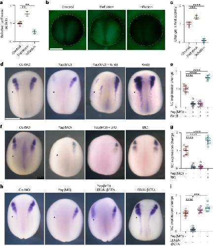 Fig. 4: Hydrostatic pressure regulates Yap activity. a, Relative luciferase activity of super Top flash after the indicated treatments, normalized to Fop flash. b, Xenopus transgenic embryos Tg(pbin7Lef-dGFP) to detect Wnt activity at stage 12.5 after the indicated treatments. c, Quantification of GFP intensity normalized to control embryos. d,f,h, In situ hybridization of snai2 at stages 16 and 17, after the indicated injections at the eight-cell stage. Asterisks indicate the injected side. Embryos injected with control Yap morpholino (Co-MO), Yap morpholino (Yap(MO)), or Wnt pathway activators. e,g,i, Quantification of snai2 expression level analysed via ISH during inhibition of Yap, and with Wnt8 mRNA (e), BIO (g), or an active form of -catenin (LEFN-CTA; i). Scale bars, 450m. Data are mean and s.d. Three independent experiments; each point represents three replicates (a). n=5 embryos for each condition (c). Statistical analysis was performed using two-sided unpaired Dunnetts tests (*P=0.0378 (i), **P0.0062 (a), ***P=0.0003 (c,i), ****P0.0001 (c,e,g,i), 95% CI). n=10control, 10Yap-MO, 8Yap-MO + Xwnt8, 6Xwnt8 embryos (e). n=10control, 10Yap-MO, 9Yap-MO + BIO, 10BIO embryos (g). n=9control, 10Yap-MO, 9Yap-MO + -cat, 9-cat embryos (l). |