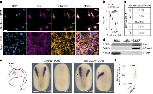Fig. 7: Nuclear Yap and -catenin extends neural crest competence. a, Immunofluorescence of iNCCs at different confluency stained for -catenin and Yap. b, Quantification of Yap nuclear-to-cytoplasmic ratio. c, Pearsons coefficient and overlap of -catenin and Yap at different confluencies. d, Co-immunoprecipitation analysis of -catenin, no specific binding IgG. e, Schematic of neural crest competence assay and in situ hybridization analysis of snai2 at stage 18. f, Quantification of neural crest competence normalized to control. Scale bars, 20m (a) and 400m (e). Data are mean and s.d. Statistical analysis was performed using ordinary two-way ANOVA and two-sided unpaired t-test (**P0.0058 (b), ****P=0.0001 (b,f), 95% CI). Three independent experiments (b,c). n=11control, 12Yap(S127A) embryos (f). Three independent experiments (d). An unprocessed blot is available as Source data. |