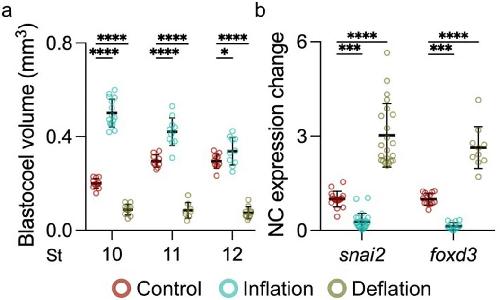 Extended Data Fig. 3 Manipulation of blastocoel volume during gastrulation. a, Spread of data points indicating change in volume between control, inflation, and deflation at stage 10 (n = 11, 15, 10 embryos, respectively), 11 (n = 10, 11, 8 embryos, respectively), and 12 (n = 11, 10, 10 embryos, respectively). b, Quantifying snai2 and foxd3 expression levels by ISH after indicated treatment. Data represent mean, error bars are s.d. Statistical analysis was performed using two-sided Dunnett’s test (*P = 0.0106; a, ***P = 0.0001; b, ****P ≤ 0.0001; a and b, CI = 95%). nsnai2 = 22control, 25inflation, 22deflation, nfoxd3 = 22control, 14inflation, 10deflation embryos (b). |