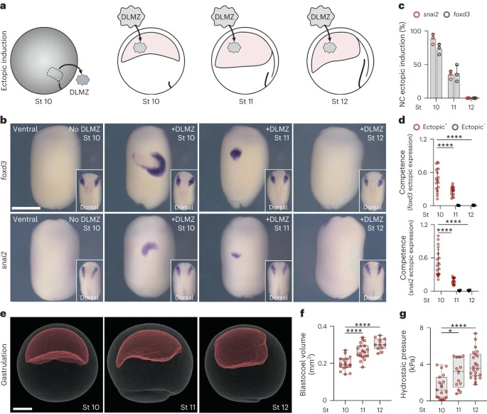 Fig. 1: Loss of neural crest competence correlates with increased hydrostatic pressure. a, Schematic of neural crest ectopic induction assay using DLMZ as the inducer (grey), grafted into host blastocoel cavity (red). b, In situ hybridization analysis of foxd3 and snai2 at stage (St) 17 and 18, respectively, seen in ventral view and dorsal view as inset. c, Spread of data indicating the percentage of embryos with ectopic induction analysed with different neural crest (NC) markers. d, Quantification of neural crest competence at the indicated stages; 10, 11 and 12 normalized to control with no graft. Embryos that exhibited ectopic induction are represented as Ectopic+ (red), and embryos with no ectopic induction are shown as Ectopic (black). e, Micro-CT of a whole mount embryo (grey) at stages 10, 11 and 12 showing blastocoel cavity (red). f,g, Quantification of blastocoel volume (f) and hydrostatic pressure (g) at stages 1012. Scale bars, 450um for ventral and 200um for dorsal (b) and 300um (e). Statistical analysis was performed using two-sided Dunnetts tests (*P=0.0164 (g), ****P0.0001 (d,f), 95% CI). Data are mean and s.d. (c). Box plots (f,g) show median, 25th and 75th percentiles, and whiskers extending to minimum and maximum values. Three independent experiments (c,d). n=17 st10, 19 st11 and 12 st12 embryos (f) and n=19 st10, 13 st11, and 22 st12 embryos (g). |