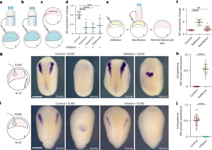 Fig. 3: Hydrostatic pressure controls neural crest competence. ac, Schematic of inflating embryo with hypotonic (a), hypertonic (b) and blastocoel fluid (c). d, Spread of data points comparing the change in snai2 expression at stage 14. e, Schematic of reinflating an embryo to normal blastocoel size after deflation with a saline solution. f, Spread of data points comparing changes in snai2 expression at stage 14. g,i, Left to right: the schematic of DLMZ graft assay into stage 12 and 10 embryos, respectively and analysed via ISH for snai2 at stages 18 and 16, respectively. h,j, Quantification of neural crest competence assay during deflation (h) and inflation (j) of Xenopus embryos. Scale bar, 450um (g,i). Data are mean and s.d. Statistical analysis was performed using two-sided Dunns test and unpaired t-tests (NS, P=0.2590 (f), ***P=0.0001 (d), ****P0.0001 (d,f,h,j), 95% CI). n=9 control, 10 hypotonic, 8 hypertonic and 13 blastocoel embryos (d), n=10 control, 1 deflation and 23 reinflation embryos (f), n competence=16 control and deflation embryos (h), n competence=18 control and inflation embryos (j). |