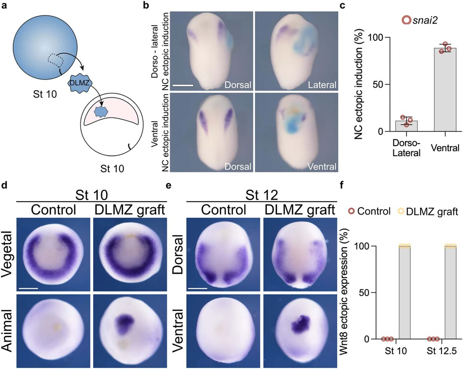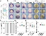 Extended Data Fig. 1 Analysis of neural crest competence. a, Schematic of neural crest ectopic induction via DLMZ assay, where stage 10 donor embryo injected with FLDX as a lineage tracer (cyan) in two blastomeres at the 2-cell stage. b, In situ hybridization of snai2 at stage 16, showing embryos with dorso-lateral and ventral ectopic induction. When the grafted tissue was located next to the host neural crest, we observed expansion in the markers, whereas when the graft was ventral, we observed proper ectopic induction; only the latter was considered in the analysis. c, Percentage of embryos exhibiting either ventral or dorso-lateral ectopic induction. d, In situ hybridization of Wnt8 positive animal and ventral sides after grafting the DLMZ into the blastocoel cavity. f, Percentage of embryos exhibiting either positive or negative ectopic Wnt8 expression. Histograms represent mean, error bars are s.d. Panels represent three independent experiments. Scale and 400um (b) and 350um (d and e). Three independent experiments (c, f). |