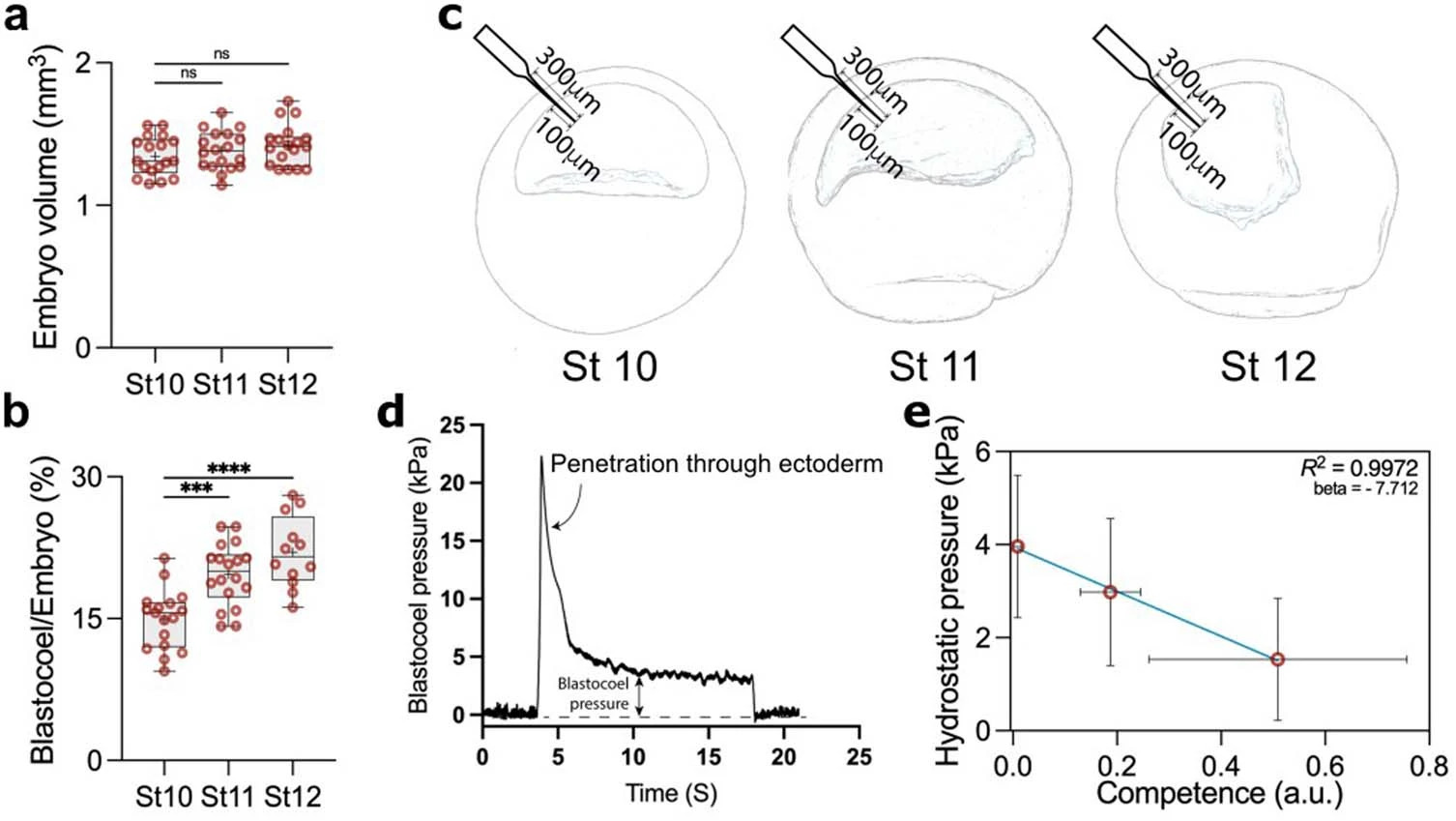 Extended Data Fig. 2 Changes in blastocoel volume and hydrostatic pressure. a, Quantification of embryo volume at stage 10 (n = 18 embryos), 11 (n = 18 embryos), and 12 (n = 18 embryos). b, Percentage of the ratio of blastocoel volume to whole embryo volume at stage 10 (n = 17), 11 (n = 18), and 12 (n = 12). c, Schematic of embryos at different stages showing microelectrode penetration (0.5-1 µm tip) through ectoderm. d, Profile of a successful measurement of blastocoel hydrostatic pressure. Pressure is close to zero whilst the microelectrode is not in contact with the embryo before and after measurement. A transitory spike is noted during penetration of the microelectrode through the ectoderm. The spike is followed by a stable phase between five to ten seconds, indicating the actual blastocoel pressure. e, Correlation between Hydrostatic Pressure and Competence. ‘R2 = 0.99 and beta = −7.7, as calculated using orthogonal distance regression (ODR) to account for measurement variability in estimating neural crest competence and the hydrostatic pressure within the blastocoel cavity. Statistical analysis was performed using two-sided Dunnett’s test (NS, P > 0.1639; a, ***P = 0.0003; b, ****P ≤ 0.0001; b, CI = 95%). Box plots (a and b) show median, 25th and 75th percentiles, and whiskers extend to minimum and maximum values. Data represent mean, error bars are s.d. (e). Three independent experiments (e). |