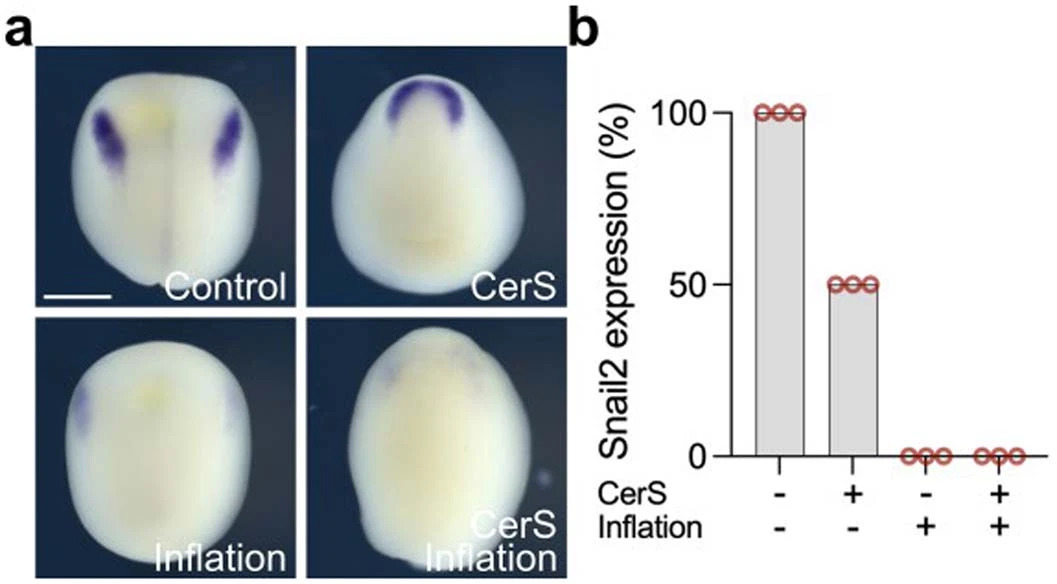 Extended Data Fig. 4 Mesoderm independent neural crest induction inhibition by hydrostatic pressure. a, In situ hybridization of snai2 at different treatments. b, Spread of data indicating snai2 expression percentage. Scale and 400 µm (a). Three independent experiments (b). |