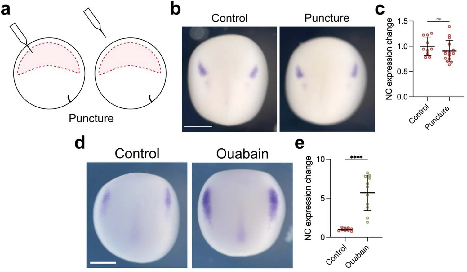 Extended Data Fig. 5 Control for mechanical manipulation of the blastocoel. a, Schematic showing the puncture procedure of inflation and deflation. Embryos were punctured with a needle similar to the one used for the inflation/deflation experiments, but no liquid was injected or removed from the blastocoel cavity. b, Embryos analyzed via in situ hybridization at stage 15 using snai2 marker. c, Spread of data points indicating the change in neural crest expression in control embryo (n=10 embryos) and punctured embryo (n=15 embryos). d, Control embryo compared to embryo treated with ouabain as described in Methods, analyzed at stage 14 using snai2 marker. e, Spread of data points comparing change in neural crest expression between control embryo (n=9 embryos) and treated embryo (n=11 embryos). Scale bar 450m (b and d). Data represent mean, error bars are s.d. Statistical analysis was performed using a two-sided unpaired student t-test (NS, P=0.2667; c and ****P0.0001; e, CI=95%). |