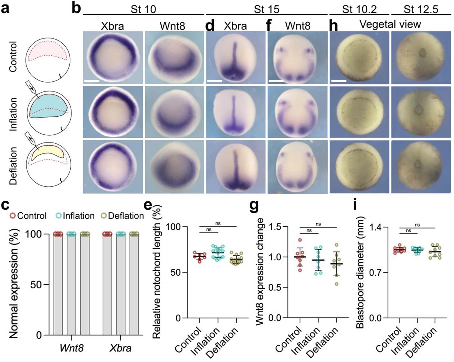 Extended Data Fig. 6 Gastrulation is not affected by changes in hydrostatic pressure. a, Schematic of mechanically changing blastocoel volume. b. In situ hybridization of embryos at stage 10 analyzing the pan-mesodermal markers Xbra and the neural crest inducer gene Wnt8. c, Percentage of embryos expressing mesodermal markers comparing control to inflated and deflated embryos. d, In situ hybridization of embryos at stage 14 analyzing the pan-mesodermal marker Xbra and neural crest marker gene Wnt8. e, Spread of data points indicating the change in notochord length normalized to total length in control (n = 7 embryos), inflation (n = 16 embryos), and deflation (n = 13 embryos). f, Effect of inflation and deflation on mesoderm ability to produce Wnt8. g, Spread of data points comparing change in Wnt8 expression in control (n = 8 embryos), inflation (n = 8 embryos), and deflation (n = 8 embryos). h, Blastopore formation and closure after inflation and deflation compared to control. i, Diameter of blastopore closure in control (n = 9 embryos), inflation (n = 8 embryos), and deflation (n = 9 embryos). Scale bar 350 µm (b, d, f, and h). Data (e, g, and i) represent mean, error bars are s.d. Statistical analysis was performed using two-sided Dunnett’s test (NS, P > 0.05 e, g, and i, CI = 95%). Three independent experiments (b and d). |