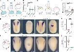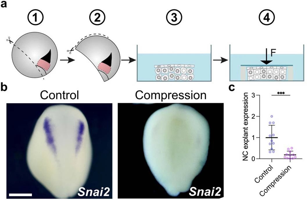 Extended Data Fig. 8 Mechanical pressure inhibits neural crest. Schematic of in vitro compression assay of neural crest explants; explants with prospective neural crest were obtained by initial dissection from dorsal blastopore lip to ventral side followed by dissection from animal pole to ventral side. Explants were then compressed under a coverslip, and compressed explants were cultured until stage 18, and the expression of the neural crest marker snai2 was analyzed. b, Representative examples of control (not compressed) and experimental (compressed) explants showing snai2 expression. c, Spread of data points comparing the neural crest expression marker in control (n = 11 explants) and compressed (n = 11 explants) conditions. Scale bar 400 µm (b). Data represent mean, error bars are s.d. Statistical analysis was performed using a two-sided unpaired student t-test (***P = 0.001; c, CI = 95%). |