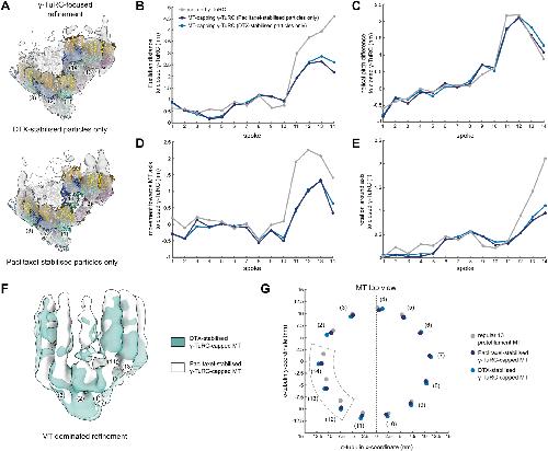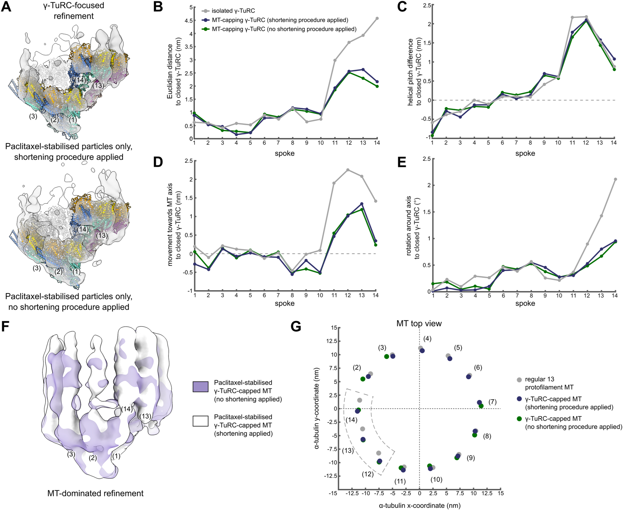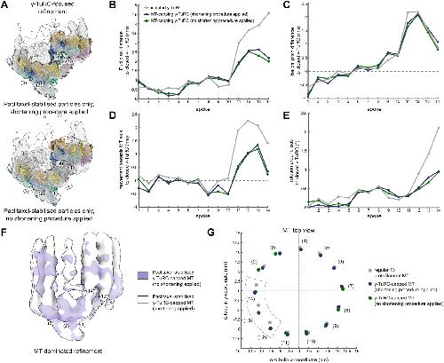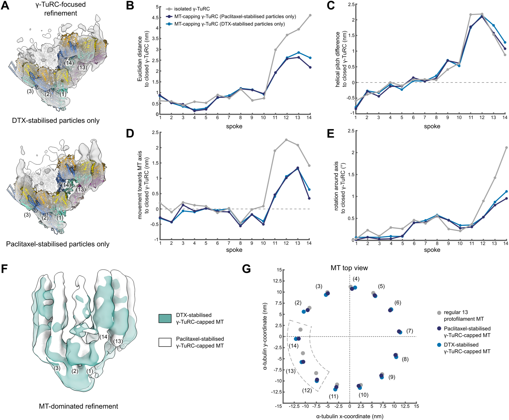 Figure EV3. The conformation of the γ-TuRC and attached MT is not affected by the identity of the MT stabilisation agent. (A) Reconstruction obtained from γ-TuRC-focused refinement of MT-capping γ-TuRCs with only DTX-stabilised particles (top) or only Paclitaxel-stabilised particles (bottom). A model for the γ-TuRC was generated for each reconstruction separately by spoke-wise rigid body docking. A high confidence threshold is used to highlight the fit at the level of γ-tubulin. Spoke numbering is indicated. Colouring as in Fig. 2A. (B–E) Euclidian translation distance (B), downward change in helical pitch (C), translation towards the MT axis (D) and rotation around the MT axis (E) required to convert the models to the hypothetical, fully closed γ-TuRC for each spoke. Parameters measured from the centre of mass of γ-tubulin. (F) Reconstructions of MT-dominated refinements of γ-TuRC-capped MTs with only DTX-stabilised (green) or only Paclitaxel-stabilised particles (white). Density for spokes in the background was hidden for visual clarity. Colouring scheme is indicated. (G) Coordinates of the centre of mass for the first α-tubulin in each protofilament in the plane orthogonal to the MT axis for regular 13 protofilament lattice (grey), Paclitaxel-stabilised γ-TuRC-capped MT (dark blue) and DTX-stabilised γ-TuRC-capped MT (light blue). Protofilaments are numbered by the respective spokes in the γ-TuRC. The MT axis is placed on the origin, (0,0). Colouring scheme is indicated. Source data are available online for this figure. |