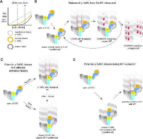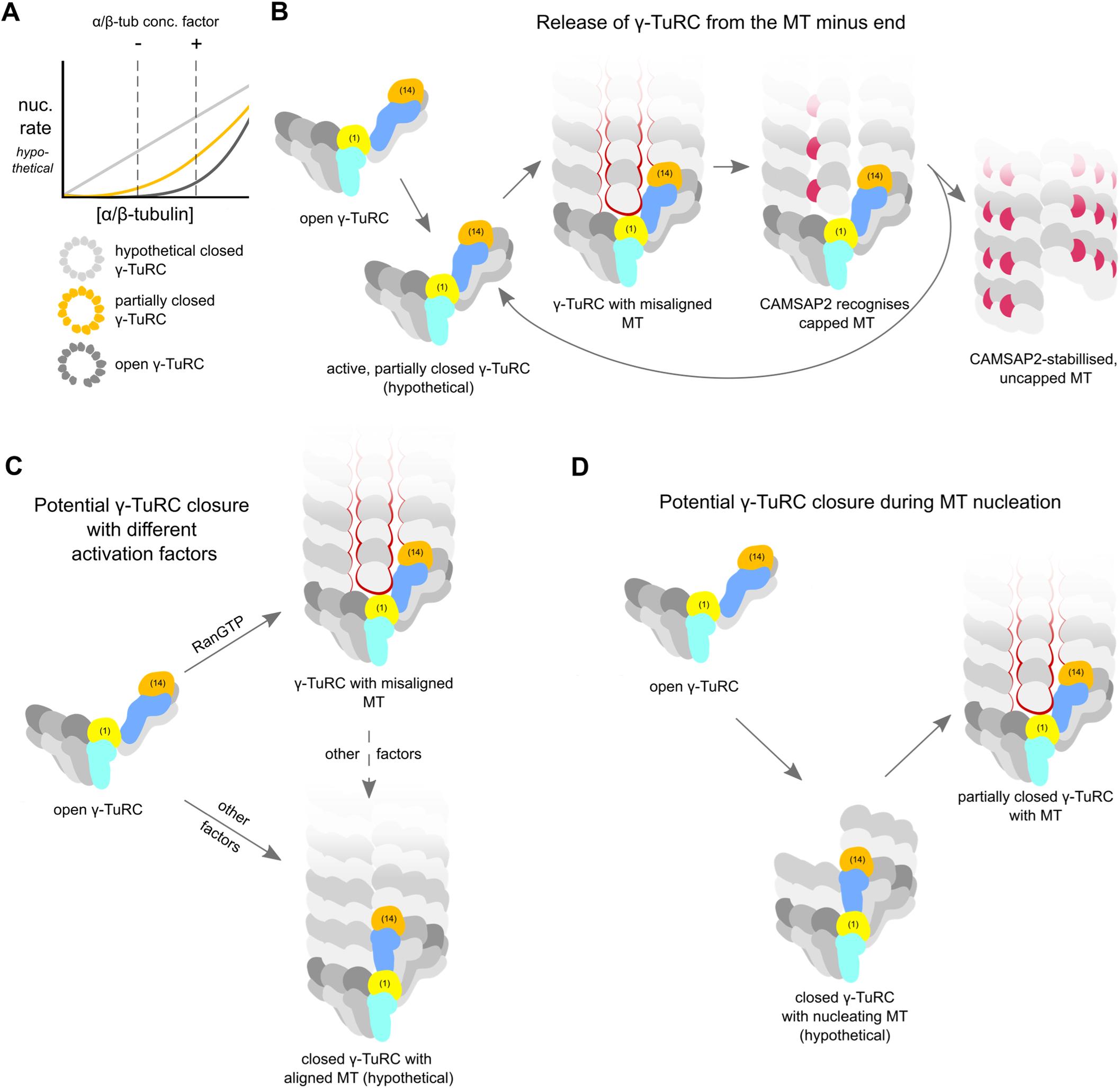 Figure 5. Possible roles for partial γ-TuRC closure and MT misalignment in the regulation of MT nucleation and release. (A) The open γ-TuRC (dark grey curve) displays highly cooperative nucleation behaviour in response to α/β-tubulin concentration but has a low base rate of nucleation (Thawani et al, 2020). The fully closed γ-TuRC (light grey) has a high base rate of nucleation with a lack of cooperativity. A partially closed γ-TuRC (orange) would likely have an intermediate base rate of nucleation, while still retaining some cooperativity. Such behaviour could aid synergy of the γ-TuRC with α/β-tubulin-enriching factors. Graphs are for illustrative purposes and do not represent experimental or simulated data. (B) Misalignment between the γ-TuRC and MT protofilaments may promote release of freshly nucleated MTs from the γ-TuRC, e.g. by CAMSAP2 (red), and recycling of nucleation-competent γ-TuRC. Spoke 1 and 14 are coloured to highlight different degrees of γ-TuRC closure. Spoke numbers are indicated for spokes 1 and 14. Missing interactions around the protofilament at spoke 2 highlighted with red outlines. (C) Different activation cues may induce different degrees of γ-TuRC closure to accommodate differential requirements of nucleation rate and minus end stability. (D) The γ-TuRC may transiently visit a fully closed conformation that favours MT nucleation and subsequently relax to the partially closed conformation observed in our study to favour MT release. |