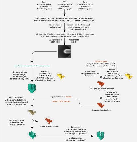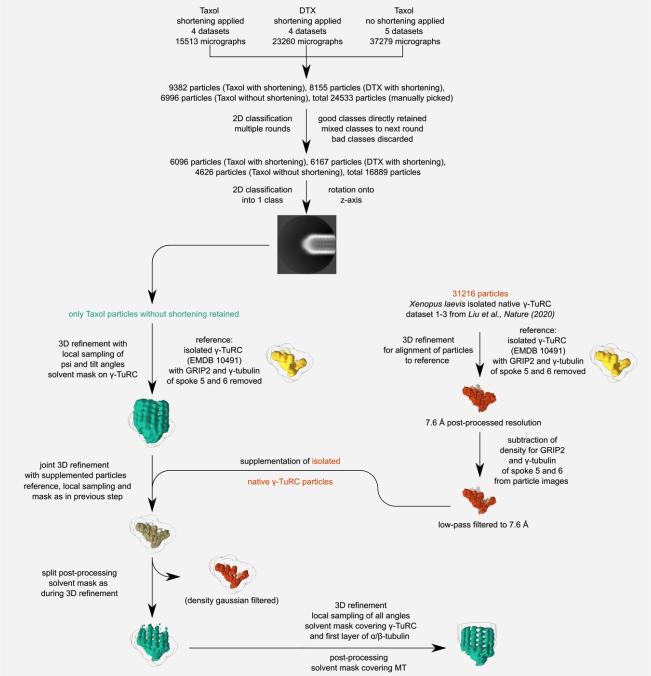 Appendix Figure S6 - Cryo-EM processing workflow for γ-TuRC-capped MTs not subjected to the shortening procedure. Detailed image processing scheme. Colours of text and reconstructions indicate the particles used for reconstruction; capped MT minus ends in green, isolated γ-TuRCs in red, a mixture of both in khaki and reference densities in yellow. Densities are shown for schematic purposes. |