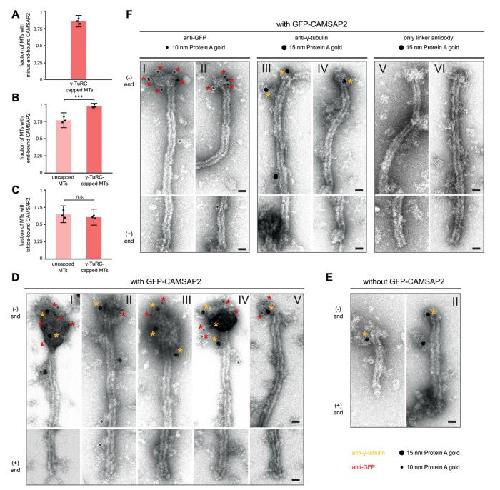 Appendix Figure S7 - Binding of CAMSAP2 to the lattice and γ-TuRC-capped minus ends of MTs nucleated through the RanGTP pathway in X. laevis egg extract. A Fraction of γ-TuRC-capped MTs with CAMSAP2 binding to the minus end observed by multi-colour fluorescence microscopy (within 1 μm of the MT end; n=69, three biological replicates). Example fluorescence microscopy images are shown in Figure 4A. B Fraction of γ-TuRC-capped MTs and uncapped MTs with CAMSAP2 binding to either end observed by multi-colour fluorescence microscopy (within 1 μm of the MT end; n=69 for capped MTs, n=60 for uncapped MTs, p=0.000418, three biological replicates). C Fraction of γ-TuRC-capped MTs and uncapped MTs with CAMSAP2 binding to the MT lattice observed by multi-colour fluorescence microscopy (i.e., >1 μm from either MT end; n=69 for capped MTs, n=60 for uncapped MTs, p=0.3181). Dots in (A), (B) and (C) indicate mean values of the three biological replicates; data are shown as mean with 95% confidence interval for all individual data points. *** p<0.001, n.s. non-significant. Significance determined using a one-tailed Welch’s t-test. D, E Immunogold labelling of γ-TuRC-capped MTs isolated from X. laevis egg extract incubated with GFP-CAMSAP2. GFP-CAMSAP2 and γ-tubulin both localise to the same end of γ-TuRC-capped MTs, which is not observed in samples where GFP-CAMSAP2 is absent (E). Red (CAMSAP2) and yellow (γ-TuRC) asterisks indicate gold beads at the MT minus end. Additional density at MT ends may be attributed to staining of antibodies as well as potential accumulation of condensates of CAMSAP2 (Imasaki et al, 2022). 9 F γ-TuRC-capped MT minus ends isolated from X. laevis egg extract were incubated with GFPCAMSAP2 and labelled with single gold conjugate: anti-GFP antibody labelled with 10 nm Protein A gold conjugated to rabbit anti-goat antibody (left), anti-γ-tubulin antibody labelled with rabbit antimouse antibody that was subsequently labelled with 15 nm Protein A gold (middle) and labelling of only rabbit anti-mouse antibody with 15 nm Protein A gold (right). Red (CAMSAP2) and yellow (γTuRC) asterisks indicate gold beads at the MT minus end. Dots in legend indicate approximate observed size of respective gold beads. Scale bar in (D), (E) and (F) represents 25 nm. Source data is available for this figure. |
