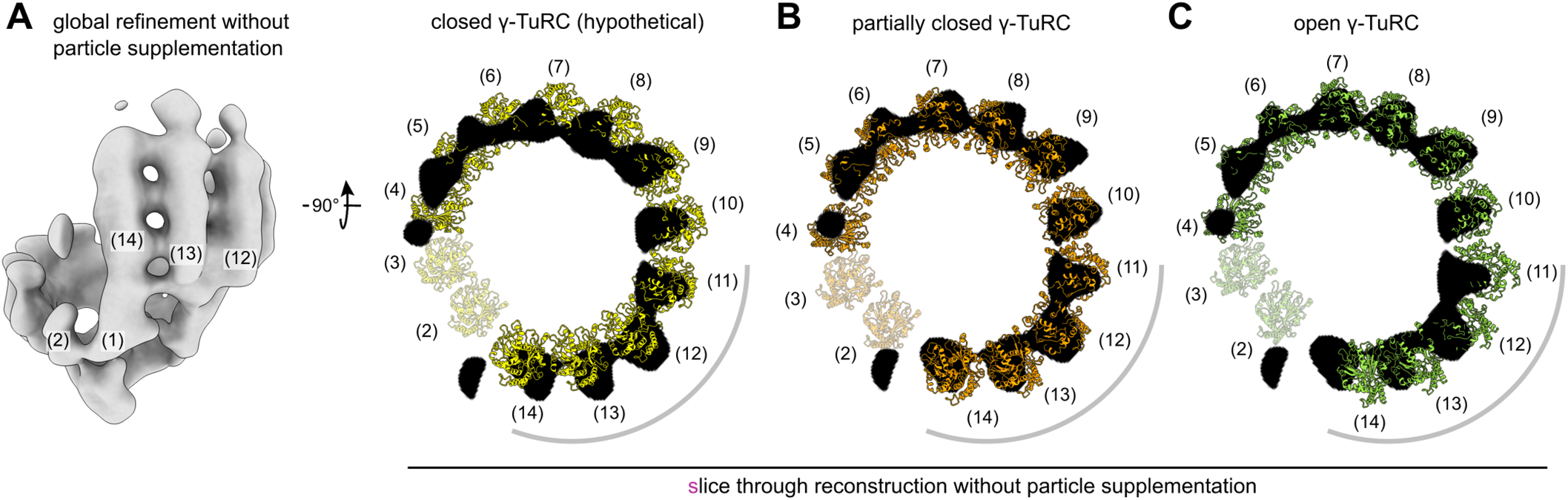 Figure EV2. Refinement and reconstruction of the MT-capping γ-TuRC without particle supplementation confirms a partially closed conformation. (A–C) Refinement of only MT-capping-γ-TuRC particles at global angular sampling, without any particle supplementation, following refinement with particle supplementation. Atomic models for the hypothetical closed γ-TuRC (Kollman et al, 2015) (A), the partially closed γ-TuRC (this study, B) and the open γ-TuRC (PDB 6TF9 (Liu et al, 2020), C) were then rigid-body docked based on the GRIP1/2 domains and γ-tubulin molecules of spokes 3 to 9. The partially closed γ-TuRC (B) fits the reconstruction well, in spite of the absence of supplemented particles during the refinement, as opposed to the closed (A) and open (C) γ-TuRC, which clearly deviate from the reconstruction, especially at spokes 11 to 14 (highlighted by a grey line). This shows that the particle supplementation does not induce bias towards the open conformation. For clarity, only a slice through the reconstruction is shown, superposed with γ-tubulin molecules 2–14 of the fit model. The slice was chosen to highlight the fit in the upper half of the spokes. As the slice does not cover spokes 2 and 3, they are shown transparent. Spoke numbering is indicated. |