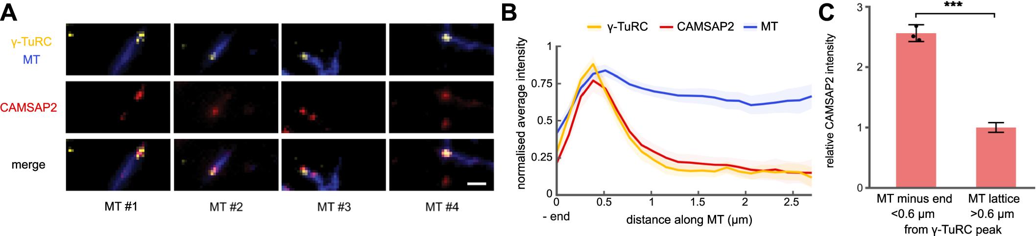 Figure 4. CAMSAP2 specifically recognises the minus end of γ-TuRC-capped MTs nucleated through the RanGTP pathway. (A) Exemplary MTs nucleated through the RanGTP pathway in X. laevis egg extract that show colocalisation of the γ-TuRC (yellow) and GFP-CAMSAP2 (red) at the minus end of MTs (blue), as judged by fluorescence microscopy. Scale bar represents 1 μm. (B) Normalised average intensity of CAMSAP2 (red), γ-TuRC (yellow) and MT signals (blue) along the length of γ-TuRC-capped MTs (n = 69). Only MTs longer than 5 μm were considered; data were combined from three biological replicates. (C) Average intensity of CAMSAP2 signal within 0.6 μm of the γ-TuRC signal peak (n = 552 from 69 MTs, of which 28, 19 and 22 for each respective replicate) or further away (n = 823 from 69 MTs). Intensities were normalised to the mean CAMSAP2 intensity on the MT lattice for each individual replicate. p = 3.2 × 10−68 Dots indicate mean values of the three biological replicates. ***p < 0.001 by a one-tailed Welch’s t-test. Data in (B) and (C) shown as mean with 95% confidence interval for all individual data points. Source data are available online for this figure. |
