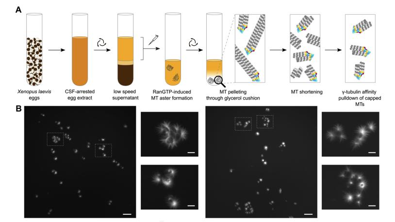 Appendix Figure S1 - Purification of γ-TuRC-capped MT minus ends from Xenopus laevis egg extract. A Schematic representation of the workflow for purification of γ-TuRC-capped MTs from Xenopus laevis egg extract. B Sample fluorescence microscopy images used for judging aster-forming capacity of Xenopus laevis egg extracts, a prerequisite for further purification of γ-TuRC-capped MT minus ends. Scale bars represent 100 µm in full images and 25 µm in zoomed cut-outs. |