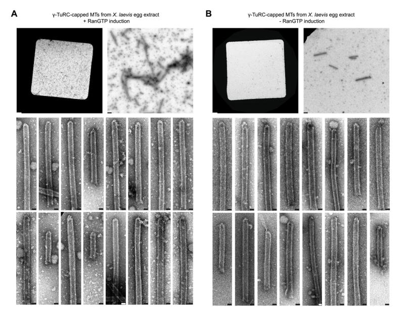 Appendix Figure S2 - RanGTP treatment drastically increases the number of γ-TuRC-capped MTs isolated from X. laevis egg extract. A,B Representative negative stain EM micrograph at the grid square level (top left, scale bars 3 µm), at intermediate magnification (top right, scale bar 200 nm) and a gallery of cut-outs at high magnification (bottom, scale bar 20 nm) of γ-TuRC-capped MTs purified with (A) or without (B) RanGTP induction. MTs were stabilised with Paclitaxel. |