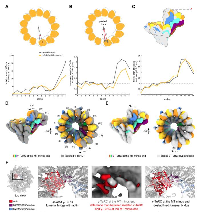 Appendix Figure S4 - Detailed structural analysis of the γ-TuRC at the MT minus end. A-C Rotation around the MT axis (A), translation towards the MT axis (B) and downward change in helical pitch (C) required to convert the isolated γ-TuRC (dark grey) or the γ-TuRC at the MT minus end (orange) to the hypothetical, fully closed γ-TuRC for each spoke. Inset schematics represent the quantified parameters. Parameters measured from the center of mass of γ-tubulin. D,E Comparison of the γ-TuRC at the MT minus end with the isolated γ-TuRC (PDB 6TF9(Liu et al, 2020), (D)) and the hypothetical fully closed γ-TuRC (E), generated from EMD 2799 (Kollman et al, 2015) (see Methods). Lumenal bridge components are omitted. Molecular surfaces generated from atomic models using the molmap function in UCSF ChimeraX (Goddard et al, 2018). F Zoom-in of the lumenal bridge in the reconstruction of the isolated γ-TuRC (left panel) and the γTuRC at the MT minus end (right), both superposed with the atomic model of the isolated X. laevis γTuRC (PDB 6TF9) (Liu et al., 2020). Difference density (red, middle panel) superposed with the reconstruction of the γ-TuRC at the MT minus end (grey) highlights that the MZT1/GCP6N and MZT1/GCP3N modules are well resolved, while density for actin is significantly reduced. All reconstructions were low-pass filtered to 17 Å. Colouring as indicated; components outside the lumenal bridge are shown in grey. Source data is available for this figure. |