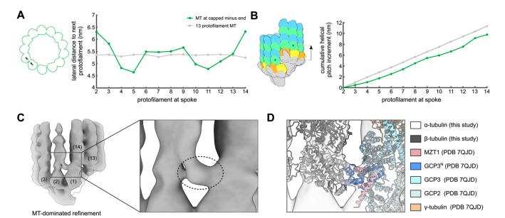Figure 3. Capped MT minus ends purified from X. laevis egg extract are asymmetric and feature breaks in inter-protofilament and protofilament-γ-tubulin contacts. (A) Cryo-EM reconstruction of the γ-TuRC-capped MT minus end, resulting from MT-dominated refinement. (B) Atomic models of a protofilament-wise fitted MT and the partially closed γ-TuRC (Fig. 2B) displayed in the density. Numbering is shown for γ-TuRC spokes; colour scheme is indicated at the bottom. (C) Distance from the MT axis for each protofilament for the MT at capped minus ends (green) or an ideal 13 protofilament MT (grey). (D) Molecular surfaces are shown for γ-tubulins (filled) and the first α-tubulin (outlined) of each protofilament. View along the MT axis; γ-tubulin of spoke 1 was omitted for clarity. (E) Lateral offsets (perpendicular to the MT axis) between γ-tubulin and the first α-tubulin of the respective protofilament. Parameters in (C) and (E) are measured from the respective subunit’s centre of mass. (F) Left: Surface representation of the MT seam in a typical 13 protofilament MT, where lateral contacts form between α- and β-tubulin (PDB 6EW0 (Manka and Moores, 2018)). Right: Surface representation of the seam location in the minus end of capped MTs. Dashed boxes indicate the location of the seam (left) or where the seam will form (right) further along the length of the MT or after potential release from the γ-TuRC. Colouring scheme as in panel (B). Source data are available online for this figure. |