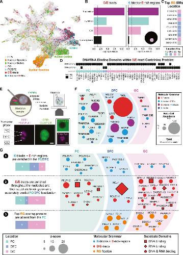 Figure 2. Proteins with K-block + E-rich regions preferentially localize to the FC, whereas the top RG-rich IDRs are depleted from the FC(A) UMAP representation of the Human Protein Atlas (HPA) with nuclear speckles, nuclear bodies, GC, and FC/DFC highlighted. Proteins containing the 140 distinct D/E tracts and 36 K-blocks + E-rich regions (ERRs) are shown in red and blue, respectively.(B) Fisher’s exact test of the frequencies of D/E tracts and K-blocks + E-rich-regions IDRs in the nucleolus, FC/DFC, GC, and nucleoplasm compared with the remaining human IDRome. The vertical line corresponds to a p value of 0.05.(C) Localization (from HPA) of the top nine scoring RG-rich IDRs in the nucleolus.(D) Examination of all DNA- or RNA-binding proteins that also contain D/E tract IDRs within the FC/DFC/GC. Both location and whether the protein contains a DNA- or RNA-binding domain are shown.(E) Schematic of method for obtaining live GVs from Xenopus oocytes and imaging nucleoli therein (see STAR Methods for details). Representative image of a nucleolus co-expressing GFP-tagged CUSTOS/c12orf43 or GFP with RFP-tagged PolR1E (subunit of RNA polymerase I with known preferential FC localization).(F) Spatial map of proteins with high-scoring K-blocks + E-rich regions and D/E tracts IDRs in the FC/DFC/GC phases of the nucleolus.(G) Summary schematic showing localization of K-blocks + E-rich regions, D/E tracts, and RG-rich IDRs with Z score ≥ 5.5.See also Figure S2. |