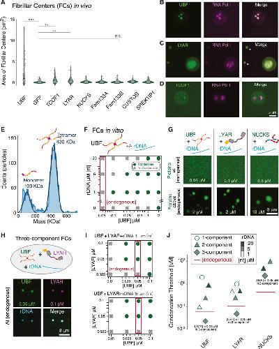 Figure 3. UBF, rDNA, and proteins containing K-blocks + E-rich regions proteins drive the formation of FC-like condensates(A) Violin plots of FC size from Xenopus oocytes monitored upon injection of 20 ng of mRNA for each of the proteins. The sizes were monitored following protein expression and leveraging the GFP tags of each of the expressed proteins; n.s. (not significant) denotes p values > 5.00e–02; **p values < 1.00e–03, ***p value < 1.00e–04.(B–D) (B) Representative images of oocyte nucleoli expressing 20 ng mRNA of GFP-tagged UBF, (C) RFP-tagged TCOF1, (D) GFP-tagged LYAR; arrowheads indicate puncta or incidental condensates85 of GFP-LYAR that form at high copy numbers.(E) Mass photometry trace of purified UBF showing raw counts (light blue histogram) and calculated distribution (dark blue line); the peak mass values indicate two populations corresponding to the masses of UBF monomers and tetramers.(F) Two-component phase boundaries of a mixture comprising rDNA and UBF. Here, green circles indicate the presence of condensates, and gray × symbols indicate a one-phase regime.(G) Confocal images of two-component mixtures consisting of rDNA (5 μM [nt]) (untagged) and UBF, LYAR, or NUCKS (fluorescently tagged) at their endogenous concentrations or at high concentrations (indicated).(H) Representative confocal image of condensates formed in three-component mixtures of rDNA (5 μM [nt]), UBF (0.05 μM), and LYAR (0.1 μM). The proteins are at their endogenous concentrations.63(I) Phase boundaries of three-component mixtures consisting of LYAR and UBF at concentrations corresponding to their endogenous concentration that contain either 1 mM rDNA (top) or 5 μM rDNA (bottom).(J) Threshold concentrations for condensation of recombinant UBF, LYAR, and NUCKS either alone (one-component, unfilled circle), with increasing concentrations of rDNA (two-component, filled triangles), or with three components (filled diamonds). In three-component mixtures, the threshold concentrations of UBF and LYAR lie below the endogenous levels of the relevant proteins (red, horizontal bar).63 Condensation was not observed for NUCKS alone or with 1 μM [nt] rDNA. Scale bars for all images, 3 μm.See also Figure S3. |