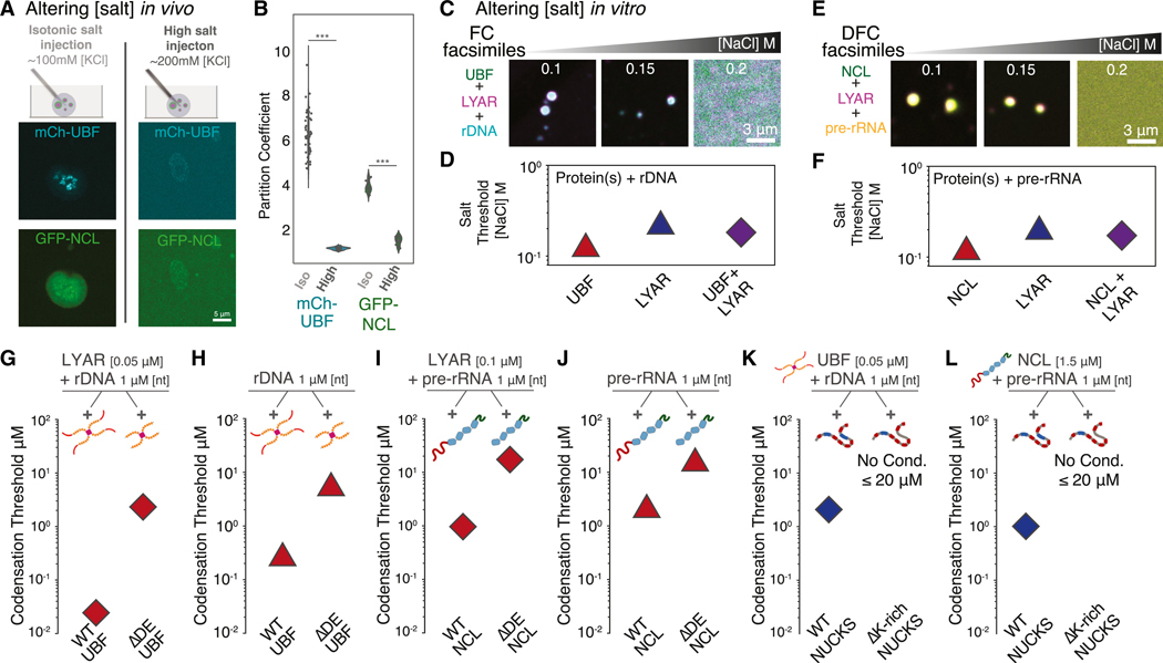 Figure 5. Complex coacervation underlies condensation of nucleoli in cells and nucleolar components in vitro(A) Schematic of injections of isotonic (light gray) or high salt (dark gray) solutions into isolated Xenopus GVs expressing mCherry-UBF and GFP-NCL; resultant KCl concentrations in GVs are predicted to be 100 and 200 mM, respectively. Confocal images shown are taken 5 min after injections.(B) Quantification of partition coefficients of mCherry-UBF in FCs and GFP-NCL in FC/DFCs relative to the surrounding nucleoplasm (n > 20); isotonic and high salt treatments are compared, ***p value < 1.00e–05.(C) Salting-in behaviors of three-component condensates comprising UBF (0.1 μM), LYAR (0.25 μM), and rDNA (5 μM [nt])) measured at the indicated salt concentrations. Representative confocal images of all three components (merge) are shown.(D) Threshold salt concentration for condensation of indicated two- and three-component mixtures.(E) Salting-in behaviors of three-component condensates comprising NCL (2 μM), LYAR (0.25 μM), and pre-rRNA (5 μM [nt])) measured at the indicated salt concentrations. Representative confocal images of all three components (merge) are shown.(F) Threshold salt concentration for salting-in of condensates indicated for two- and three-component mixtures.(G and H) (G) Condensate thresholds of UBF and ΔD/E-UBF in three-component condensates with rDNA (5 μM [nt]) and LYAR (0.1 μM) or (H) two-component condensates with rDNA (5 μM [nt]).(I and J) (I) Condensate thresholds of NCL and ΔD/E-NCL in three-component condensates with pre-rRNA (5 μM [nt]) and LYAR (0.1 μM) or (J) two-component condensates with pre-rRNA (5 μM [nt]).(K) Condensation thresholds of WT NUCKS and ΔK-rich NUCKS in three-component condensates with rDNA (5 μM [nt]) and UBF (0.05 μM) or (L) in three-component condensates with pre-rRNA (5 μM [nt]) and NCL (1.5 μM).See also Figure S5. |