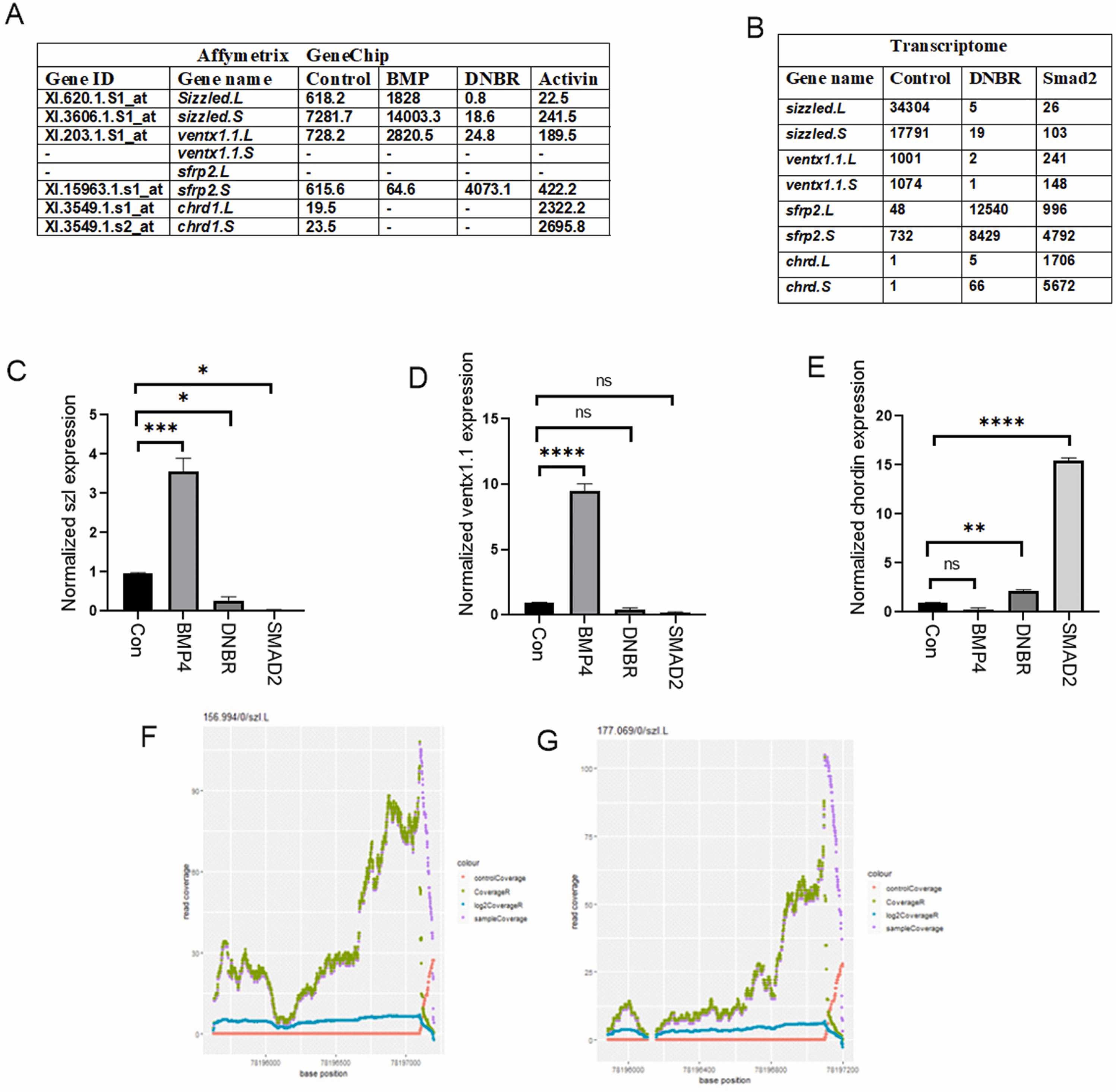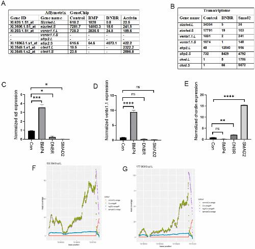 Fig. 2. Bmp regulative response elements reside within the sizzled promoter. (A) List of dorso-ventral marker genes selected from affymetrix gene chip data including sizzled (frzb3). (B) List of dorso-ventral marker genes selected from transcriptome data including sizzled. (C-E) qRT-PCR analysis of the gene expression levels in animal cap explants from embryos injected with BMP4, Smad2, and DNBR. qRT-PCR values were determined from the ΔΔCt for the target genes relative to ODC. Significantly different results for treatments used 1-way ANOVA with Graph Pad Prism; P < .05. (F) Coverage plot of 3F. Smad1 within the sizzled promoter proximal region. (G) Coverage plot of 3flag-Ventx1.1 within the sizzled promoter proximal region. The asterisks represent the statistical significance of the multiple comparisons. Each number of stars (1, 2, 3, or 4) corresponds with a p-value. The more stars there are, the smaller the p-value and the greater the significance. ANOVA, analysis of variance; DNBR, dominant negatine Bmp receptor; ODC, ornithine decarboxylase.