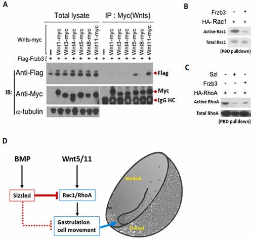 Fig. 5. Frizzled physically interacts with noncanonical Wnt signaling molecules and reduces small GTPases Rac1 and RhoA activation. (A) Flag-tagged Frzb3 were injected alone and in combination with different Myc-tagged Wnt ligands (both canonical and noncanonical Wnts) into 1-cell stage embryos and immunoprecipitation assay were performed to check the physical interaction between Frzb3 and Wnts. (B) and (C) Ha-Rac1 were injected with and without frzb3 mRNA and HA-RhoA were injected with, without, and in combination of frzb3 and szl mRNAs into 1-cell stage. Small GTPase Pulldown assay was performed to observe the small GTPases activation. (D) Proposed model of noncanonical Wnt signaling-mediated cell movement inhibition via Bmp synexpression gene, sizzled.