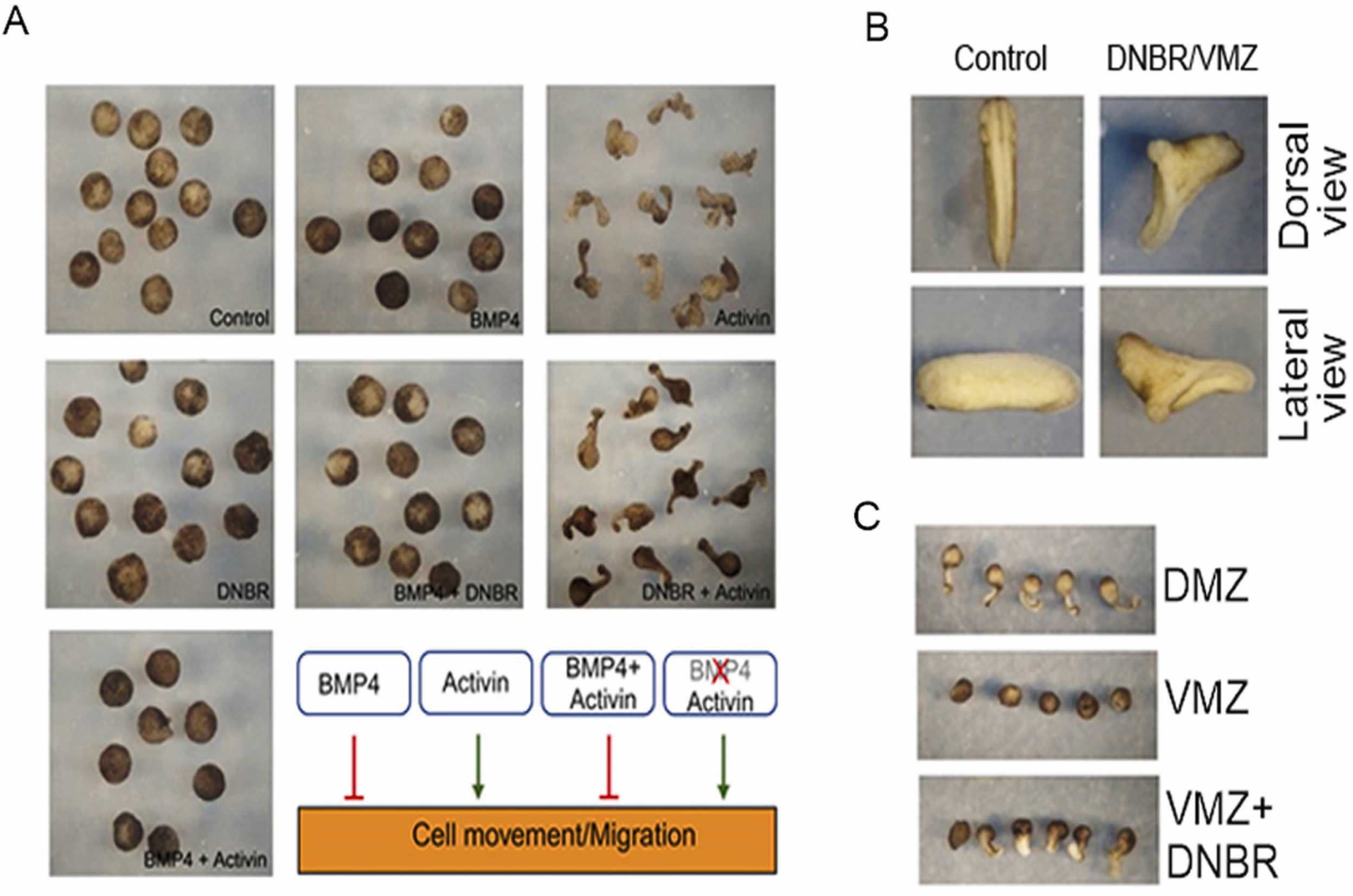 Fig. 1. Bmp4 inhibits activin-induced CE movement in Xenopus embryos. (A) Embryos were injected with bmp4 and dnbr mRNAs (1 ng/5 nL each) alone and in combination treated with or without activin protein (50 ng/mL). Animal caps were dissected at early stage 8 and incubated in L-15 media until stage 11 (mid gastrula). Ectodermal explants elongation was observed in each treated animal caps sample sets. (B) Dnbr mRNA (1 ng/5 nL) were injected to embryos in the ventral marginal zone (VMZ) at 4-cell stage and grown until late neurula stage. The lateral and dorsal areas were shown to observe the effect of Bmp signaling inhibition on embryos. (C) Dorsal marginal zone (DMZ) and VMZ were dissected from embryos injected with dnbr mRNA into the VMZ at 4-cell stage. Cell elongation assay were performed to analyze the effect of Bmp inhibition. mRNA, messgenger RNA.