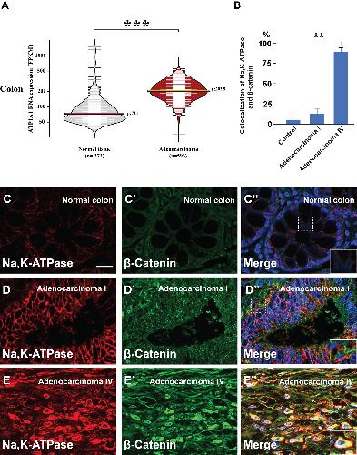 Fig. 1.Na,K-ATPase subunit α is overexpressed in colon cancer. (A) ATP1A1 RNA overexpression is significantly associated with colon adenocarcinoma. Bean plot analyses of ATP1A1 expression in 596 adenocarcinomas and 373 healthy colon samples reveal an approximately threefold difference in expression. The width of the horizontal lines represents the number of samples at each value, while the pink and yellow lines indicate the average ATP1A1 expression in normal colon and adenocarcinoma, respectively. The triple black asterisk indicates a P-value of 2.33×10−23 obtained via a two-tailed Student's t-test. (B) Quantification of the colocalization between Na,K-ATPase, and β-catenin in normal colon and in advanced stages of cancer from human array sections. (C-E″) Immunohistochemistry from B shows strong colocalization between Na,K-ATPase and β-catenin in advanced colon cancers (inset). Error bars denote SEM (n≥3) (**P<0.01). Scale bars: 10 μm. Human array sections were quantified in triplicate fields. |