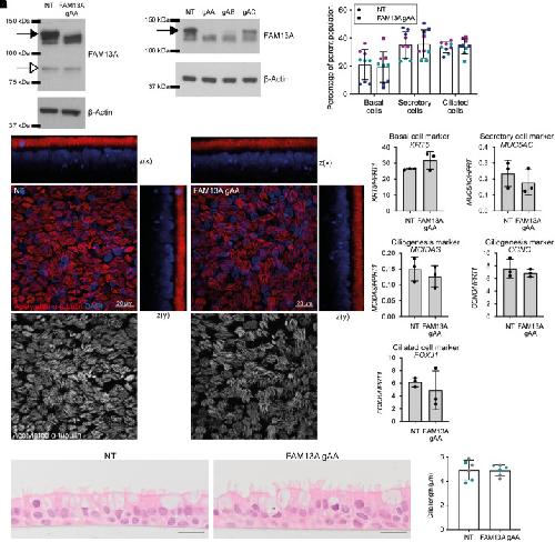 . FAM13A long-isoform knockdown does not affect hBEC differentiation. (A) FAM13A isoform expression in hBEC cultures edited with nontargeting control (NT) or “FAM13A gAA” CRISPR guide RNA. Long isoform is indicated with a closed arrow, and short isoform is indicated with an open arrow (expected molecular weights were 117 kD and 80 kD, respectively). (B) Expression of FAM13A long isoform (closed arrow) protein in hBEC cultures edited with NT or three CRISPR guide RNAs targeting the FAM13A long isoform. (C) Flow cytometry analysis of epithelial cell populations in NT and FAM13A gAA cultures. Three independent experiments between Day 25 and Day 31 of ALI culture (annotated in different colors), triplicate cultures per experiment. Data indicate mean ± SD. (D) Immunofluorescent staining of cilia (acetylated α-tubulin, red) in NT and FAM13A gAA differentiated hBEC cultures, Scale bars, 20 μm. (E) mRNA expression of epithelial cell marker genes in NT and FAM13A gAA differentiated hBECs. Values are normalized to HPRT1. Bars represent triplicate cultures from a single donor; results are representative of experiments from two donors, mean ± SD. (F) Hematoxylin and eosin staining of NT and FAM13A gAA differentiated hBEC cultures. Scale bars, 20 μm. (G) Quantification of cilia length from hematoxylin and eosin staining of NT and FAM13A gAA differentiated hBEC cultures. Two independent cultures of hBECs from different donors, three Transwells per genotype, 100 cilia lengths measured per Transwell. Data indicate mean ± SD; two-way ANOVA, not significant.