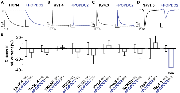 Figure 1. Functional screen for cardiac ion channels modulated by POPDC2(A–D) Representative current traces of (A) HCN4, applying a voltage step from −30 mV to −120 mV within 6 s, from a holding potential of −30 mV, (B) Kv1.4, applying a voltage step from −80 mV to +40 mV within 2 s, from a holding potential of −80 mV, (C) Kv4.3, applying a voltage step from −80 mV to +40 mV within 2 s, from a holding potential of −80 mV or (D) Nav1.5, applying a voltage step from −80 mV to −20 mV within 50 ms, from a holding potential of −80 mV, expressed alone (black) or together with POPDC2 (blue) in Xenopus laevis oocytes.(E) Indicated cardiac channels or the Na+/K+ ATPase (Na/K) were expressed alone or together with POPDC2 in Xenopus oocytes and relative changes in current amplitudes by POPDC2 were plotted. Oocytes were stored in a storage solution lacking theophylline. The number of technical replicates (n) is indicated in parentheses. Data are presented as mean ± s.e.m. Significance was probed using a two-sided Student’s t-test. ∗∗∗, p < 0.001.