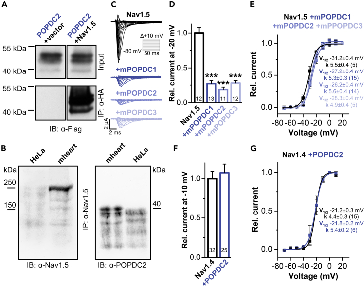 Figure 2. Interaction of POPDC proteins with the cardiac sodium channel Nav1.5 or the skeletal muscle sodium channel Nav1.4(A) Co-immunoprecipitation of POPDC2-FLAG with Nav1.5-HA was performed in COS-7 cells using anti-HA antibodies. An empty vector served as control. The co-immunoprecipitation was subsequently detected with an anti-FLAG antibody (IB: α-Flag).(B) Co-immunoprecipitation of POPDC2 and Nav1.5 in murine heart lysates (mheart) using anti Nav1.5 antibodies (IP: α-Nav1.5). The immunoprecipitation was subsequently detected with an anti-Nav1.5 (IB: α-Nav1.5) and the co-immunoprecipitation by an anti-POPDC2 antibody (IB: α-POPDC2). HeLa cells were used as a control.(C) Oocytes were injected with cRNA for human Nav1.5 or co-injected with different murine POPDC isoforms and subsequently stored in a storage solution lacking theophylline. Currents were recorded with a P/N (N = 4) voltage-step protocol (holding potential −80 mV) and voltage-steps of 50 ms ranging from −70 to +80 mV in 10 mV increments (see inset).(D and E) (D) Relative current amplitudes analyzed at −20 mV and normalized to Nav1.5. (E) Voltage-dependence of Nav1.5 activation in the absence or presence of POPDC1, POPDC2 or POPDC3. The respective voltages of half-maximal activation (V1/2) and the Boltzmann constants (k) are provided as inset. The number of technical replicates (n) is indicated in parentheses or bar graphs. Data are presented as mean ± s.e.m. Significance was probed using a two-sided Student’s t-test. ∗∗∗, p < 0.001.(F and G) (F) POPDC2 does not modulate current amplitudes of Nav1.4, analyzed at −10 mV and normalized to Nav1.4 or (G) the shape of the voltage-dependence of Nav1.4 activation. The respective voltages of half-maximal activation (V1/2) and the Boltzmann constants (k) are provided as inset. The number of technical replicates (n) is indicated in parentheses or bar graphs. Oocytes were stored in a storage solution lacking theophylline. Data are presented as mean ± s.e.m. Significance was probed using a two-sided Student’s t-test. See also Figures S1 and S2.