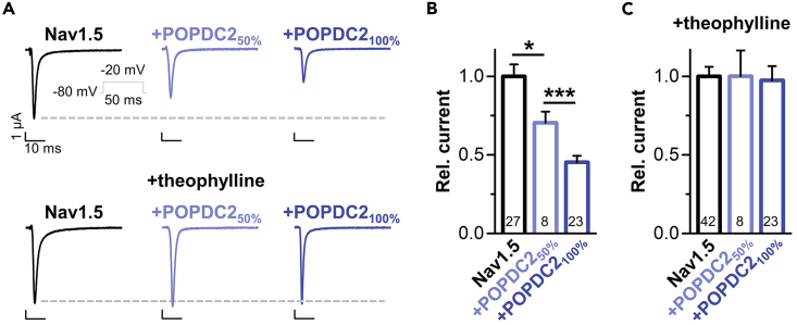 Figure 4. POPDC2 reduces Nav1.5 current amplitudes in a cAMP-dependent manner(A) POPDC2 modulation of Nav1.5 is cAMP-dependent. Representative current traces recorded by voltage steps to −20 mV. Oocytes were injected with 10 ng Nav1.5 alone or 10 ng Nav1.5 together with 5 ng POPDC2 (50%) or 10 ng POPDC2 (100%), and stored in ND96 solution with or without theophylline before voltage-clamp measurements in oocytes. Inset illustrates the applied voltage protocol.(B) Analyses of peak current amplitudes from experiments performed in (A), analyzed at −20 mV and normalized to Nav1.5. The number of technical replicates (n) is indicated in bar graphs. Data are presented as mean ± s.e.m. Significance was probed using a two-sided Student’s t-test. ∗, p < 0.05; ∗∗∗, p < 0.001.(C) Oocytes were injected as in (A-B) but incubated in a storage solution containing theophylline. Relative current amplitudes were analyzed at −20 mV and normalized to Nav1.5. The number of technical replicates is indicated in bar graphs. Data are presented as mean ± s.e.m. See also Figure S4.