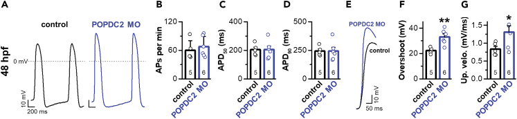 Figure 6. Morpholino-mediated knock-down of popdc2 modifies embryonic cardiac action potential in the zebrafish heart(A) Representative voltage traces of cardiac action potentials in zebrafish embryos. POPDC2 MO: Morpholino-mediated knock-down of popdc2. hpf: hours postfertilization.(B–D) Analysis of (B) action potential frequency, (C) APD50, and (D) APD90. The number of biological replicates is indicated in bar graphs. Data are presented individually but also as mean ± s.e.m.(E) Representative voltage traces of cardiac action potentials in embryonic zebrafish focusing on the fast depolarization phase.(F) Analysis of the action potential overshoot. The number of biological replicates is indicated in bar graphs. Data are presented individually but also as mean ± s.e.m. Significance was probed using a two-sided Student’s t test. ∗∗, p < 0.01.(G) Analysis of the action potential upstroke velocity. The number of biological replicates is indicated in the individual bar graphs. Data are presented individually but also as mean ± s.e.m. Significance was probed using a two-sided Student’s t-test. ∗, p < 0.05.