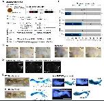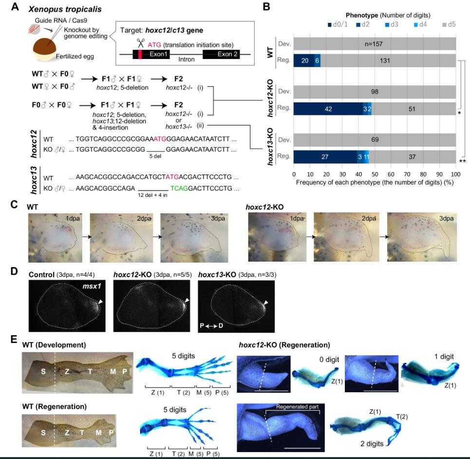Fig. 2: Knockout of hoxc12/c13 by genome editing and its effects on larval limb regeneration.A Knockout of hoxc12 and hoxc13 genes by genome editing. ATG of each gene was chosen as the target site, and the diploid Xenopus tropicalis was used. B Effects on phenotypes. Knocking out hoxc12/c13 had no effect on limb development but did affect larval regeneration. Phenotypes were evaluated based on the number of digits, and digit formation was determined by the existence of a nail at its tip. Statistical test (binomial test, two-sided) *p = 5.7 × 10−13, **p = 7.6 × 10−9. C Knocking out hoxc12/c13 had no effects on initial blastema formation, at least morphologically. D The expression pattern of msx1, a typical marker gene for the initial phase of regeneration, is normal even in the hoxc12KO/c13KO individuals. Control: hoxc12 and hoxc13 double heterozygous individuals (hoxc12+/−hoxc13+/−). E Examples of limb morphologies and cartilage patterns in normal development (left upper), normal larval regeneration (left lower), and in regeneration of hoxc12KO individuals (right; see Supplementary Fig. 4B for phenotypes of hoxc13KO individuals). hoxc12KO: hoxc12−/−; hoxc13KO: hoxc13−/−. |