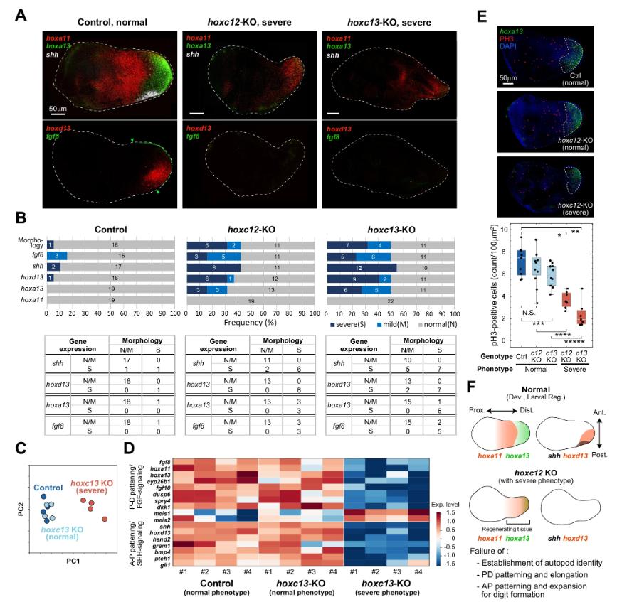 Fig. 3: Roles of hoxc12/c13 in reactivating patterning/growth during larval limb regeneration.A Typical spatial expression of patterning genes in the blastema of control (hoxc12+/+), hoxc12KO (hoxc12−/−), and hoxc13KO (hoxc13−/−) individuals at 4 dpa. B Statistics for the phenotypes in blastema morphology and gene expression for control (hoxc12+/+), hoxc12KO (hoxc12−/−), and hoxc13KO (hoxc13−/−) individuals. Biologically independent samples were used. N: normal; M: mild; S: severe. C Principal component analysis. D Comparative analysis of transcriptome data for typical patterning genes that function during limb development. E Effects of hoxc12/c13 knockout on cell proliferation in the prospective autopod region. Ctrl: hoxc12+/−. Box-plot elements: center line, median; box limits, upper and lower quartiles; whiskers, max/min. Statistical test (Student’s t-test, two-sided): *p = 2.44 × 10−5; **p = 2.43 × 10−6; ***p = 0.037; ****p = 2.81 × 10−4, *****p = 7.64 × 10−6. All data were obtained from biologically independent samples: n = 9 (Ctrl); n = 12 (c12KO, normal); n = 10 (c13KO, normal); n = 7 (c12KO, severe); n = 7 (c13KO, severe). F Summary of phenotypes. Source data are provided as a Source Data file. |