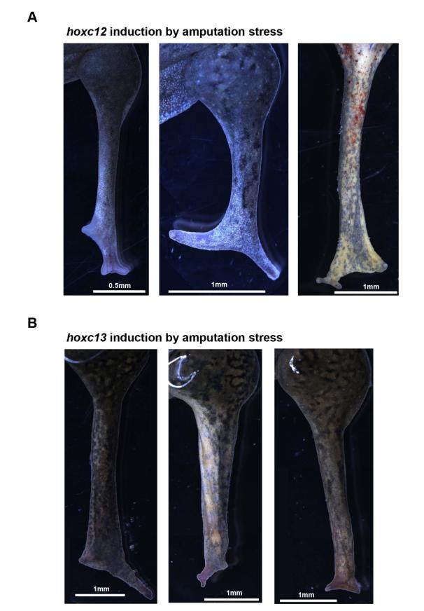 Fig. S11. Regenerated limbs with multifurcated distal cartilage Phenotypes generated by (A) hoxc12 or (B) hoxc13 induction by amputation stress (without heatshock). |