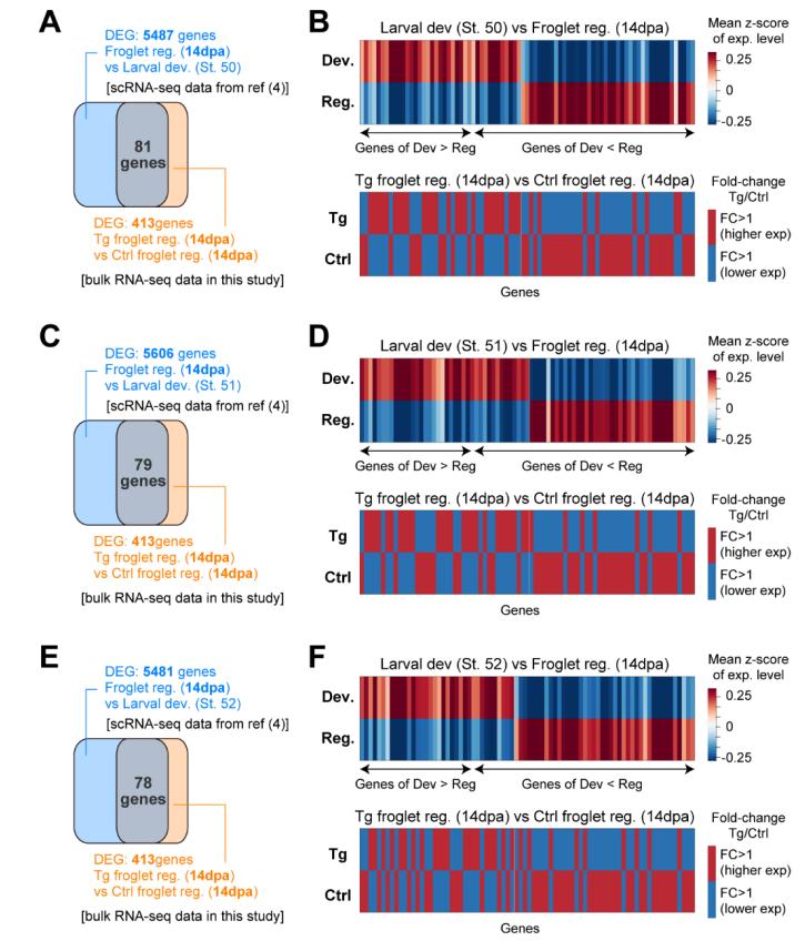 Fig. S16. Comparative transcriptome analysis. (A, C, E) Extraction of differentially expressed genes (DEGs) between developing limb buds (A: St. 50; C: St. 51, E: St. 52) and froglet blastema (14dpa) based on single cell transcriptome data from Lin et al (2021) (DEGbl-dev), and DEGs between hoxc12Tg/control froglet blastema (14dpa) based on bulk-transcriptome data obtained in this study (DEGTg). (B, D, F) Comparison of expression levels for genes that are common in both DEGbl-dev and DEGTg, which are identified in A, C, and E, respectively; (top) developing limb bud vs froglet blastema and (bottom) Tg vs control froglet blastema. Source data are provided as a Source Data file. |