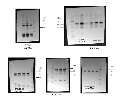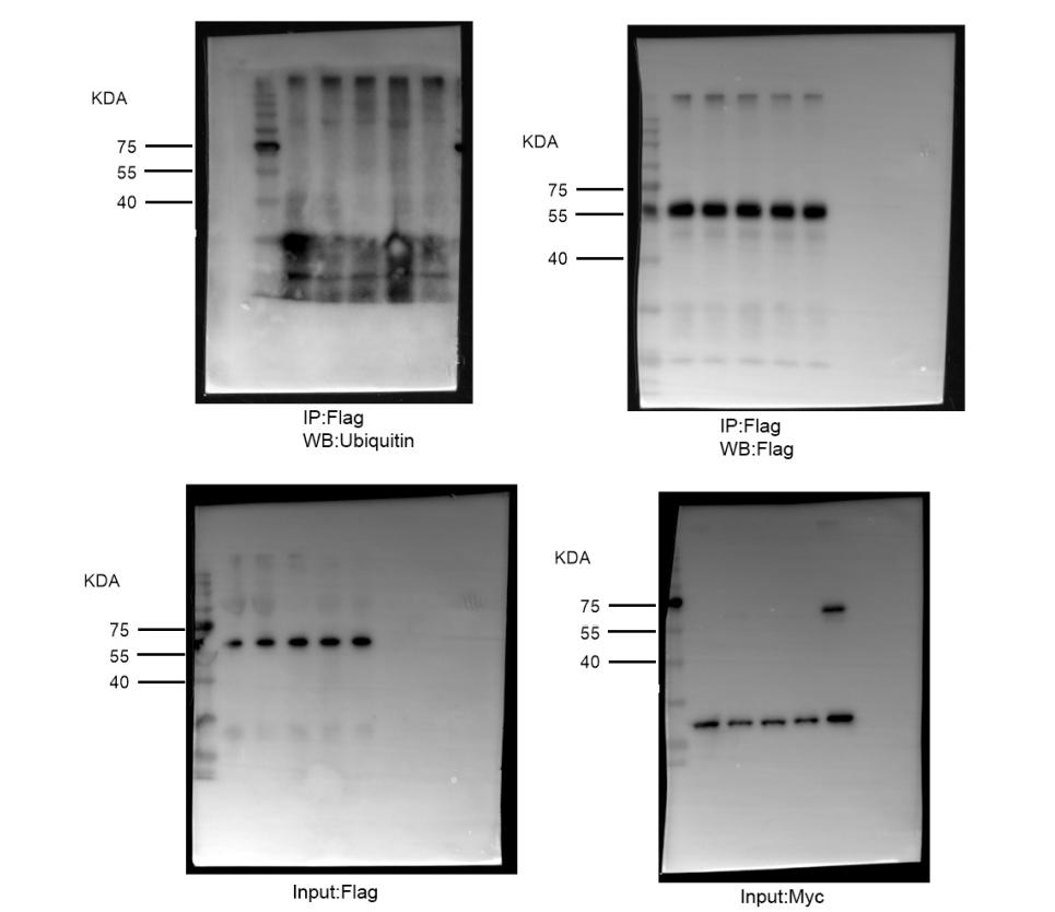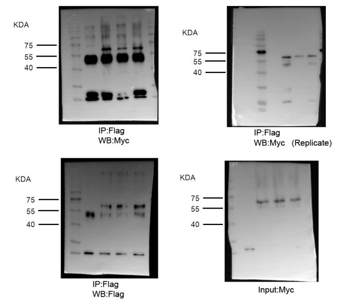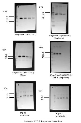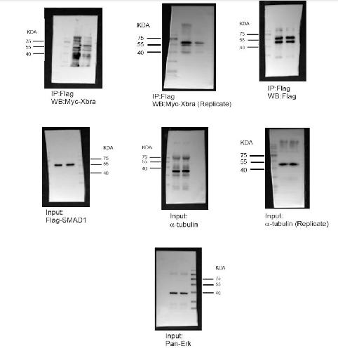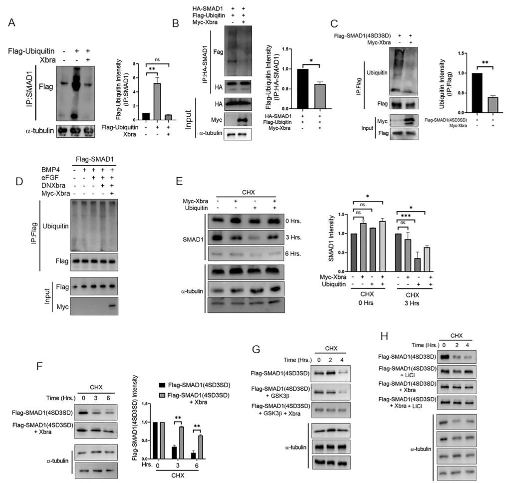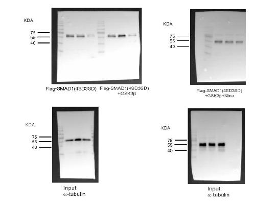 Figure 4. Xbra inhibits the polyubiquitination and degradation of endogenous Smad1 as well as a phospho-mimetic Smad1 Mutant. (A) Embryos injected with flag-ubiquitin with or without myc-xbra harvested at stage 10.5 for co-immunoprecipitation analysis using anti-smad1 and anti-flag antibodies. α-tubulin served as loading control. Right: Flag-Ubiquitin level were quatified by photo shop software. This experiment was repeted two times with consistemce results. (B) Embryos injected with HA-smad1(WT) and Flag-ubiquitin with or without myc-xbra harvested at stage 10.5 for co-immunoprecipitation analysis using anti-ha and anti-flag antibodies. α-tubulin served as loading control. Right: Flag-Ubiquitin level were quatified by photo shop software. This experiment was repeted two times with consistemce results. (C) Embryos injected with Flag-smad1(4SD3SD) with or without myc-xbra harvested at stage 10.5 for co-immunoprecipitation analysis using anti-flag and anti-ubiquitin antibodies. Right: Endogenous Ubiquitin level were quatified by photo shop software. This experiment was repeted two times with consistemce results. (D) Embryos injected with flag-Smad1, DNXbra and Myc-Xbra alongwith BMP4 and eFGF embryos were harvested at the stage of 10.5 for co-immunoprecipitation analysis using anti-flag and ubiquitin antibody. (E) Embryos injected with myc-xbra and ubiquitin alone or in combination were treated with 200 μM/ml of cycloheximide at stage 10.5 and harvested at 0 h. 3 h. and 6 h. for WB analysis using anti smad1 antibody. α-tubulin served as loading control. Right: Endogenous smad1 level were quatified by photo shop software. This experiment was repeted two times with consistemce results. (F) Embryos injected with flag-smad1(4SD3SD) with or without myc-xbra were treated with 200 μM/ml of cycloheximide at stage 10.5 and harvested at 0 h. 3 h. and 6 h. for WB analysis using anti-flag antibody. α-tubulin served as loading control. Right: Flag-smad1 level were quatified by photo shop software. This experiment was repeted two times with consistemce results. (G) Embryos injected with flag-smad1(4SD3SD), myc-xbra and myc-xbra alone or in combination were treated with 200 μM/ml of cycloheximide at stage 10.5 and harvested at 0 h. 2 h. and 4 h. for WB analysis using anti-flag antibody. α-tubulin served as loading control. (H) Embryos injected with flag-smad1(4SD3SD) and with or without xbra were treated with 200 μM/ml of cycloheximide and Licl at stage of 10.5 and harvested at 0 h. 2 h. and 4 h. for WB analysis using anti-flag antibody. α-tubulin served as loading control. |