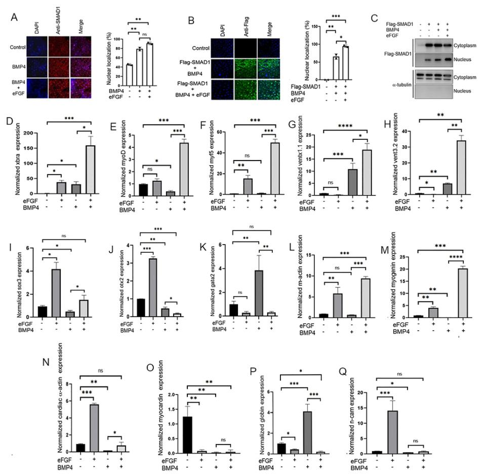 Figure 1. Influence of eFGF on smad1 nuclear localization and gene expression in BMP4-treated animal cap explants. (A) Subcellular localization of smad1 in Xenopus animal cap explant in the presence of control, BMP4 and BMP4 with eFGF injected. Animal cap dissected at 9.5 stage and grown until stage 10.5, fixed and then subjected to immunofluorescence assay with primary antibody against endogenous smad1 and anti-rabbit Alexa-fluor 594 secondary antibody (Invitrogen) was used. Blue: DAPI, Red: endogenous smad. Scale bar ×20. This experiment was repeated two times with consistent results. Right: Statistic data of smad1 nuclear translocation ratio. (B) Subcellular localization of flag-smad1 in Xenopus animal cap explant in the presence of control flag-smad1, flag-smad1 with BMP4 and flag-smad1 with BMP4 and eFGF injected. Animal cap dissected at 9.5 stage and grown until stage 10.5, fixed and then subjected to immunofluorescence assay with primary antibody against endogenous smad1 and anti-mouse Alexa-fluor 488 secondary antibody (Invitrogen) was used. Blue: DAPI, Green: flag tag. Scale bar ×20. This experiment was repeated two times with consistent results. Right: Statistic data of Flag-smad1 nuclear translocation ratio. (C) Animal cap from the embryos injected with Flag-Smad1, BMP4 and eFGF were used to fractionate cytoplasmic and nuclear lysate to perform WB analysis using anti-flag antibody. (D–Q) qRT-PCR Analysis of the gene expression levels of early and late markers in animal cap explants from embryos injected with eFGF and BMP4 together or separately. qRT-PCR values were determined from the ΔΔCt for the target genes relative to odc. Significantly different results for treatments used one-way ANOVA with Graph Pad Prism; P < 0.05. |
