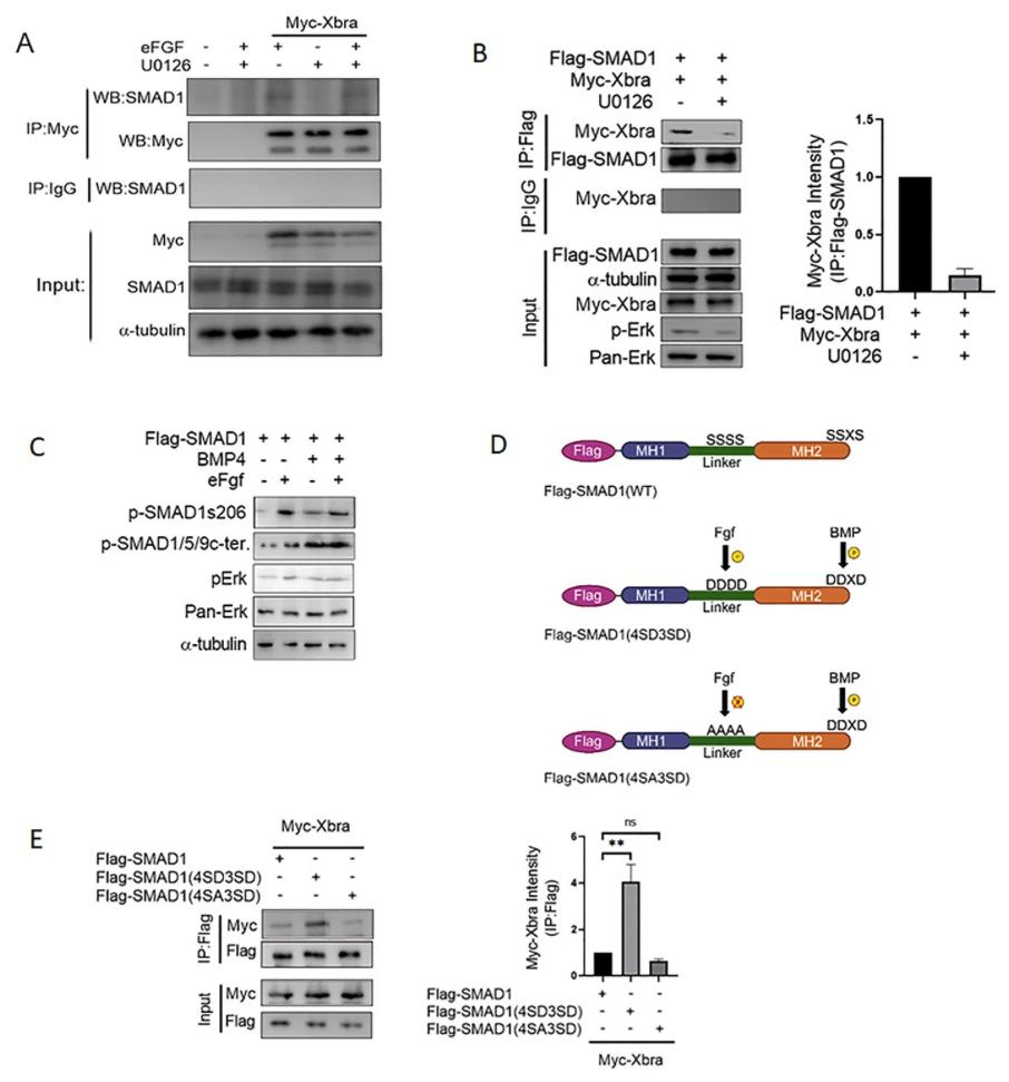 Figure 2. Synergistic enhancement of Smad1/Xbra complex formation through eFgf and Bmp4 stimulation. (A) Animal cap from embryos injected with myc-xbra and eFGF either treated with U0126 or control DMSO and harvested for co-immunoprecipitation analysis using endogenous smad1 and anti-myc antibodies. (B) Animal cap from embryos injected with flag-smad1 and myc-xbra either treated with U0126 or control DMSO and harvested for co-immunoprecipitation analysis using anti-flag and anti-myc antibodies. α-tubulin served as loading control. Right: Flag-smad1 level were quatified by photo shop software. This experiment was repeted two times with consistemce results. (C) Immunoblotting analysis of total lysates from animal cap explant from embryo injected with flag-smad1 together with or without eFGF and BMP4 lysates were analyzed by immunoblotting using p-smad1linker206, p-smad1linker214, p-smad1/5/9c-terminal and p-Erk antibody. Pan Erk and α-tubulin served as a loading control. (D) Smad1 phospho-mutant forms, constitutively active FGF- and BMPR-mediated phosphorylated form of flag-smad1(4SD3SD), and constitutively inactive FGF- and active BMPR-mediated phosphorylated form of flag-smad1(4SA3SD) along with wild type. (E) Embryos injected with flag-smad1 (WT), flag-smad1(4SD3SD) or flag-smad1(4SA3SD) with myc-xbra and harvested for co-immunoprecipitation analysis using anti-flag and anti-myc antibodies. Right: Myc-Xbra level were quatified by photo shop software. This experiment was repeted two times with consistemce results. |