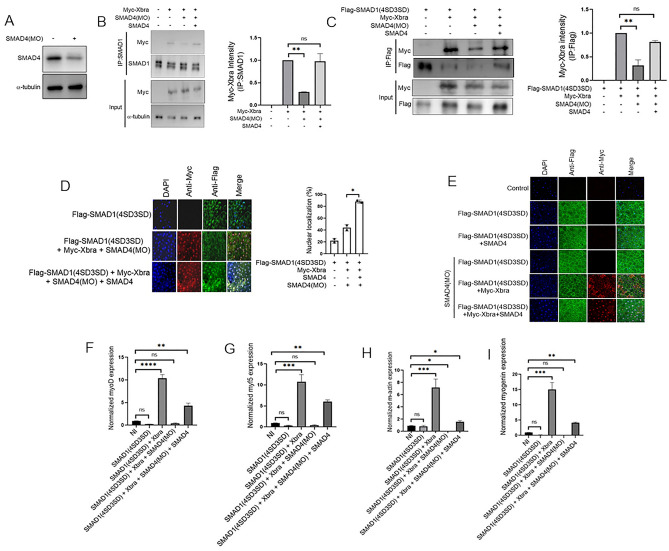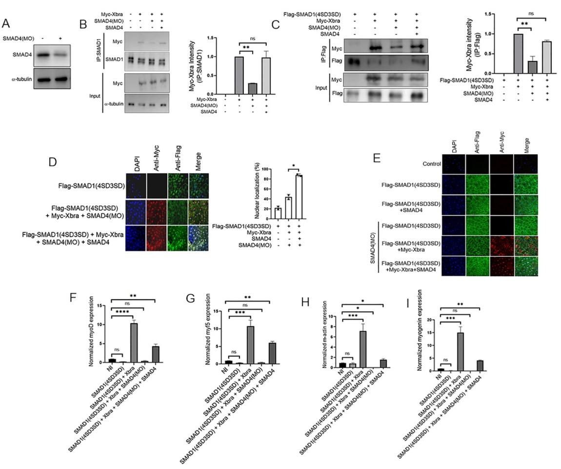 Figure. 5 Smad4 plays a crucial role in the formation of the Smad1/Xbra complex, and it is essential for facilitating the nuclear localization and transcription activity of the phospho-mimetic Smad1 mutant mediated by Xbra. (A) Embryos injected with smad4MO harvested at stage 10.5 and subjected for WB analysis using anti-smad4 antibody. (B) Embryos injected with myc-xbra and smad4 with and without smad4MO harvested at stage 10.5 for co-immunoprecipitation analysis using anti-smad1 and anti-myc antibodies. α-tubulin served as loading control. Right: Myc-Xbra level were quatified by photo shop software. This experiment was repeted two times with consistemce results. (C) Embryos injected with Flag-smad1(4SD3SD), myc-xbra and smad4 with and without smad4MO harvested at stage 10.5 for co-immunoprecipitation analysis using anti-Flag and anti-myc antibodies. Right down: Myc-Xbra level were quatified by photo shop software. This experiment was repeted two times with consistemce results. (D) Subcellular localization of flag-smad1(4SD3SD) in Xenopus animal cap explant from embryos injected with flag-smad1(4SD3SD), myc-xbra and smad4 with or without smad4MO. Animal cap dissected at 9.5 stage and grown until stage 10.5, fixed and then subjected to immunofluorescence assay using primary antibody against flag-tag and myc-tag. Anti-mouse Alexa-fluor 488 and anti-rabbit Alexa fluor 594 secondary antibody (Invitrogen) was used. Blue: DAPI, Green: flag tag, Red: myc-tag. Scale bar ×20. This experiment was repeated two times with consistent results. Right: Statistic data of smad1 nuclear translocation ratio. (E) Subcellular localization of flag-smad1(4SD3SD) in Xenopus animal cap explant from embryos injected with flag-smad1(4SD3SD), smad4, smad4MO and Myc-Xbra in the shown combination. Animal cap dissected at 9.5 stage and grown until stage 10.5, fixed and then subjected to immunofluorescence assay using primary antibody against flag-tag and myc-tag. Anti-mouse Alexa-fluor 488 and anti-rabbit Alexa fluor 594 secondary antibody (Invitrogen) was used. Blue: DAPI, Green: flag tag, Red: myc-tag. Scale bar ×20. (F–I) qRT-PCR Analysis of the gene expression levels of early markers in animal cap explants from embryos injected with smad1(4SD3SD), xbra and smad4 with or without smad4MO. qRT-PCR values were determined from the ΔΔCt for the target genes relative to odc. Significantly different results for treatments used one-way ANOVA with Graph Pad Prism; P < 0.05. (G,H) qRT-PCR Analysis of the gene expression levels of late markers in animal cap explants from embryos injected with smad1(4SD3SD), xbra and smad4 with or without smad4MO. qRT-PCR values were determined from the ΔΔCt for the target genes relative to odc. Significantly different results for treatments used one-way ANOVA with Graph Pad Prism; P < 0.05. |