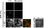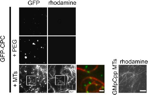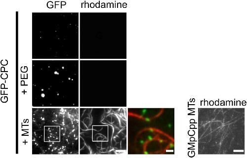 Figure 3. MTs induce phase separation of CPC. About 100 nM of GMpCpp-stabilized rhodamine-labeled MTs induced phase separation of 1 μM soluble GFP-CPC as imaged by TIRF microscopy; scale bar for gray scale images represent 5 μm; scale bar for pseudo-colored inset represents 1 μm. The top panel shows soluble GFP-CPC/CPC sample; middle panel shows CPC phase separation induced by PEG; the bottom panel shows CPC phase separation induced by MTs (conditions without PEG). For reference, image to the right shows GMpCpp-stabilized rhodamine-labeled single MTs (not bundled) before the incubation with the CPC; scale bar represents 5 μm. Experiment was repeated twice. CPC, chromosomal passenger complex; MT, microtubule; TIRF, total internal reflection fluorescence. |