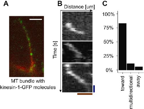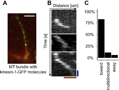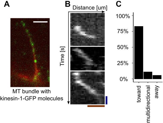 Figure 4. MTs generated by LLPS CPC are oriented with plus ends inside the CPC condensate. A, an example of single Cy5-labeled MT bundle with kinesin-GFP molecules (green dots); scale bar represents 5 μm.