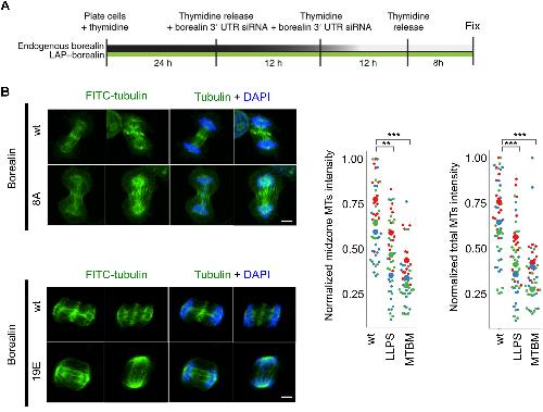 Figure 6. CPC phase separation and MT bundling are important for formation of bundled structures on the anaphase spindle. A, experimental design to visualize spindles in the first mitosis after knockdown and replacement of Borealin by siRNA in HeLa cells. B, fluorescence images of HeLa cells with endogenous Borealin replaced with WT or indicated Borealin mutants and stained for α-tubulin and DAPI. Maximum intensity projections of representative images are shown; scale bar represents 5 μm. Experiment was repeated three times, and the different colors in the quantifications represent experimental replicates; data were normalized between experimental replicates by dividing the mean values of intensity of signal from MTs by the maximum of the total intensity within each experimental replicate; CEN-Borealinwt (n = 28, 38, 32); CEN-BorealinLLPS (n = 26, 28, 42); and CEN-BorealinMTBM (n = 26, 30, 38). pwt-LLPS = (0.015, 0.00022, 0.0058); pMTBM = (1.77× 10−6, 6.9 × 10−5, 3.3 × 10−8). For statistical analysis, Welch's t test with Bonferroni correction was applied; ∗p < 0.05, ∗∗p < 0.01, ∗∗∗p < 0.001. CPC, chromosomal passenger complex; DAPI, 4′,6-diamidino-2-phenylindole; MT, microtubule. |