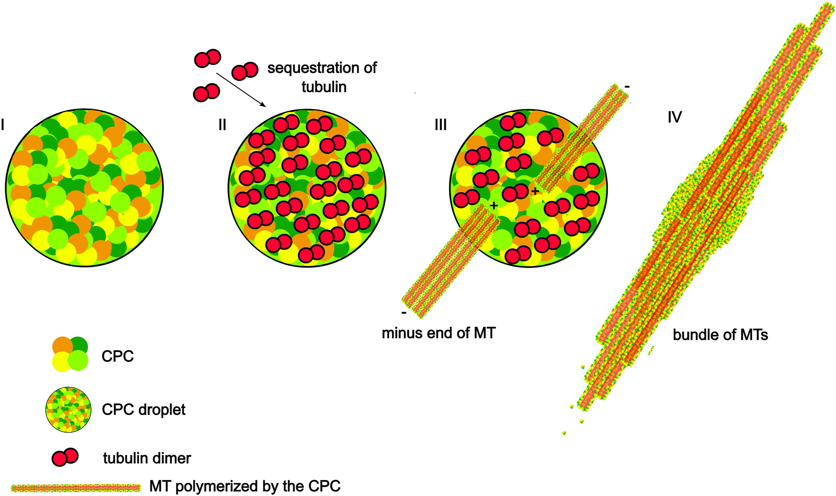 Figure 7. A model of LLPS of the CPC leads to formation of bundle of MT. The CPC in liquid–liquid demixed state (I) sequesters free tubulin (II) increasing the tubulin concentration. That allows for nucleation and MT polymerization in such a way that MTs are parallel with minus end pointing outward (III). Such process leads to formation of MT bundles (IV). CPC, chromosomal passenger complex; LLPS, liquid–liquid phase separation; MT, microtubule. |