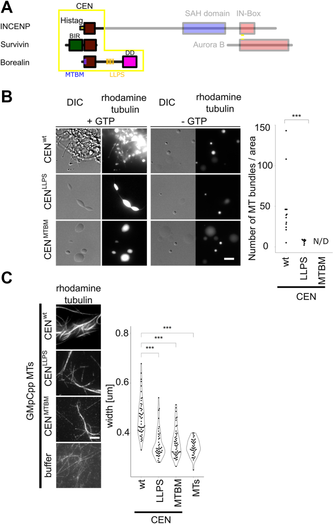 Figure 5. Phase separation propensity and MT binding of Borealin subunit of the CPC are important for MT nucleation and bundling. A, scheme of the CPC; CEN: centromere-targeting domain composed of full-length Survivin and Borealin, N-terminal fragment of INCENP. Mutations introduced to Borealin amino acid sequence are presented as blue (MTBM) and orange (LLPS) lines. The regions of the CPC that are not part of the CEN domain are faded out. B, DIC and fluorescence images of rhodamine-labeled MTs generated by CEN-Borealinwt, CEN-BorealinLLPS, and CEN-BorealinMTBM. Experiment was repeated three times. Plot shows the number of MT bundles per μm2; total number of MT bundles for CEN-Borealinwt (n = 612), for CEN-BorealinLLPS (n = 61); pwt-LLPS = 5.5 × 10−5, CEN-BorealinMTBM—not detected (N/D); scale bar represents 5 μm. C, GMpCpp-stabilized rhodamine-labeled MT bundled by CEN-Borealinwt, CEN-BorealinLLPS, and CEN-BorealinMTBM imaged in TIRF mode with excitation at 555 nm (rhodamine tubulin). Plot shows quantification of the width of single bundles of MTs. Experiment was repeated twice; CEN-Borealinwt (n = 49), CEN-BorealinLLPS (n = 43), CEN-BorealinMTBM (n = 49), MTs (n = 39); pwt-LLPS = 1.05 × 10−9; pwt-MTBM = 1.68 ×10−9. Statistical analysis was performed by applying Kolmogorov–Smirnov test; ∗p < 0.05, ∗∗p < 0.01, ∗∗∗p < 0.001; scale bar represents 5 μm. CPC, chromosomal passenger complex; DIC, differential interference contrast; LLPS, liquid–liquid phase separation; MT, microtubule; TIRF, total internal reflection fluorescence. |